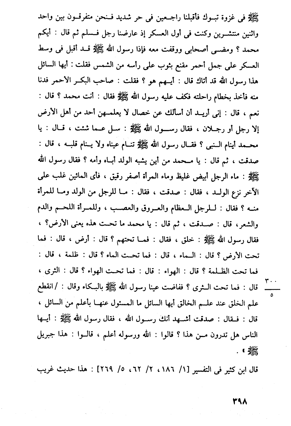 -صلى اللَّه عليه وسلم- في غزوة تبوك فأقبلنا راجعين في حر شديد فنحن متفرقون بين واحد واثنين منتشرين وكنت في أول العسكر إذ عارضنا رجل فسلم ثم قال: أيكم محمد؟ ومضى أصحابى ووقفت معه فإذا رسول اللَّه -صلى اللَّه عليه وسلم-قد أقبل في وسط العسكر على جمل أحمر مقنع بثوب على رأسه من الشمس فقلت: أيها السائل هذا رسول اللَّه قد أتاك قال: أيهم هو؟ فقلت: صاحب البكر الأحمر فدنا منه فأخذ بخطام راحلته فكف عليه رسول اللَّه -صلى اللَّه عليه وسلم- فقال: أنت محمد؟ قال: نعم، قال: إنى أريد أن أسألك عن خصال لا يعلمهن أحد من أهل الأرض إلا رجل أو رجلان، فقال رسول اللَّه -صلى اللَّه عليه وسلم-: سل عما شئت، قال: يا محمد أينام النبي؟ فقال رسول اللَّه -صلى اللَّه عليه وسلم- تنام عيناه ولا ينام قلبه، قال: صدقت، ثم قال: يا محمد من أين يشبه الولد أباه وأمه؟ فقال رسول اللَّه -صلى اللَّه عليه وسلم-: ماء الرجل أبيض غليظ وماء المرأة أصفر رقيق، فأى المائين غلب على الآخر نزع الولد، فقال: صدقت، فقال: ما للرجل من الولد وما للمرأة منه؟ فقال: للرجل العظام والعروق والعصب، وللمرأة اللحم والدم والشعر، قال: صدقت، ثم قال: يا محمد ما تحت هذه يعنى الأرض؟، فقال رسول اللَّه -صلى اللَّه عليه وسلم-: خلق، فقال: فما تحتهم؟ قال: أرض، قال: فما تحت الأرض؟ قال: الماء، قال: فما تحت الماء؟ قال: ظلمة، قال: فما تحت الظلمة؟ قال: الهواء: قال: فما تحت الهواء؟ قال: الثرى، قال: فما تحت الثرى؟ ففاضت عينا رسول اللَّه -صلى اللَّه عليه وسلم- بالبكاء وقال: انقطع علم الخلق عند علم الخالق أيها السائل ما المسئول عنها بأعلم من السائل، قال: فقال: صدقت أشهد أنك رسول اللَّه، فقال رسول اللَّه -صلى اللَّه عليه وسلم-: أيها الناس هل تدرون من هذا؟ قالوا: اللَّه ورسوله أعلم، قالوا: هذا جبريل -صلى اللَّه عليه وسلم-".
