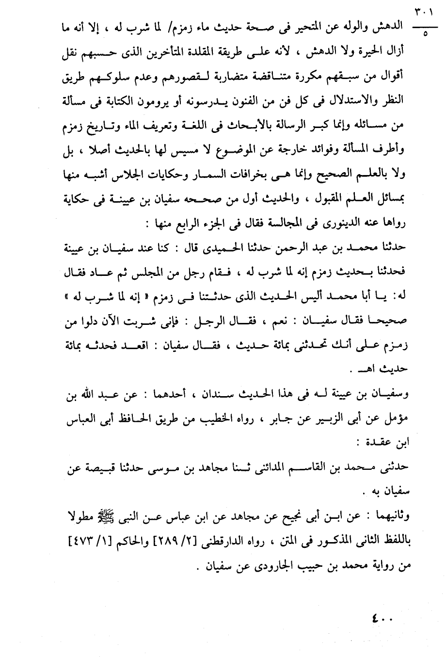 الدهش والوله عن المتحير في صحة حديث ماء زمزم لما شرب له، إلا أنه ما أزال الحيرة ولا الدهش، لأنه على طريقة المقلدة المتأخرين الذي حسبهم نقل أقوال من سبقهم مكررة متناقضة متضاربة لقصورهم وعدم سلوكهم طريق النظر والاستدلال في كل فن من الفنون يدرسونه أو يرومون الكتابة في مسألة من مسائله وإنما كبر الرسالة بالأبحاث في اللغة وتعريف الماء وتاريخ زمزم وأطرف المسألة وفوائد خارجة عن الموضوع لا مسيس لها بالحديث أصلا، بل ولا بالعلم الصحيح وإنما هي بخرافات السمار وحكايات الجلاس أشبه منها بمسائل العلم المقبول، والحديث أول من صححه سفيان بن عيينة في حكاية رواها عنه الدينورى في المجالسة فقال في الجزء الرابع منها: