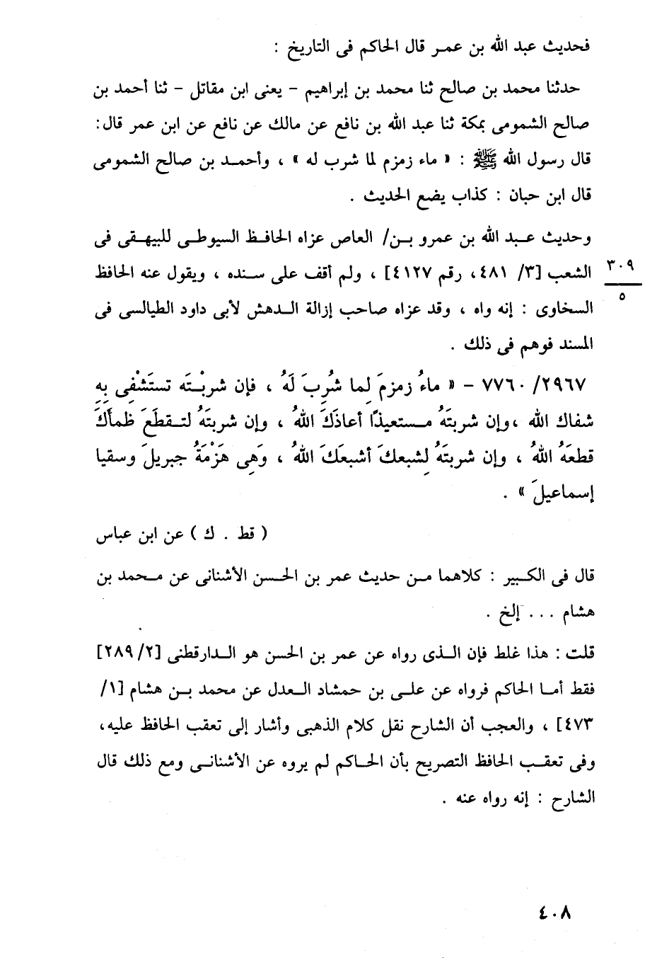 حدثنا محمد بن صالح ثنا محمد بن إبراهيم -يعنى ابن مقاتل- ثنا أحمد بن صالح الشمومى بمكة ثنا عبد اللَّه بن نافع عن مالك عن نافع عن ابن عمر قال: قال رسول اللَّه -صلى اللَّه عليه وسلم-: "ماء زمزم لما شرب له"، وأحمد بن صالح الشمومى قال ابن حبان: كذاب يضع الحديث.