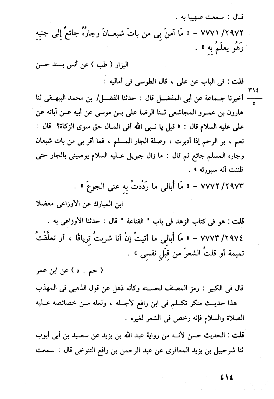 2972/ 7771 - "مَا آمنَ بِى من باتَ شبعانَ وجارُهُ جائعٌ إِلى جنبِهِ وَهُو يعلَمُ بِهِ".