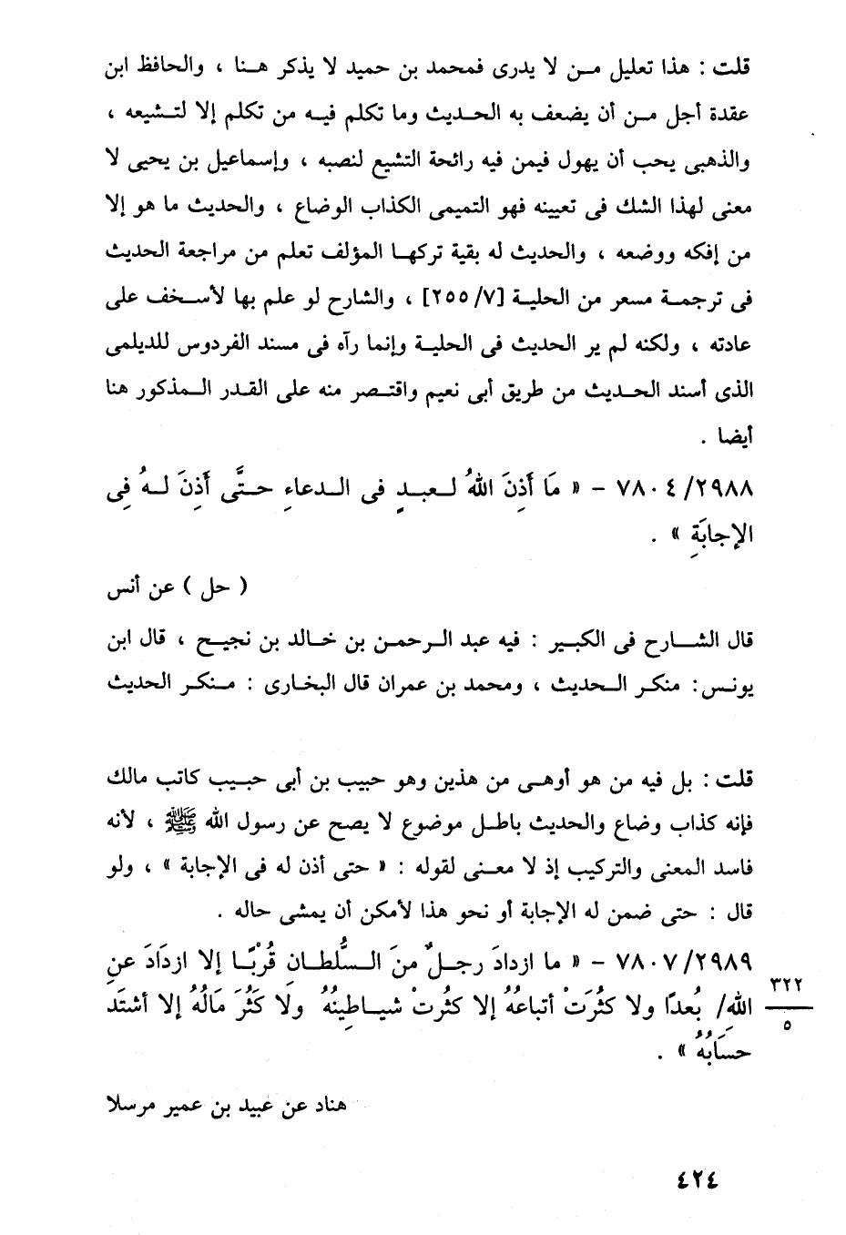 قلت: هذا تعليل من لا يدرى فمحمد بن حميد لا يذكر هنا، والحافظ ابن عقدة أجل من أن يضعف به الحديث وما تكلم فيه من تكلم إلا لتشيعه، والذهبى يحب أن يهول فيمن فيه رائحة التشيع لنصبه، وإسماعيل بن يحيى لا معنى لهذا الشك في تعيينه فهو التميمى الكذاب الوضاع، والحديث ما هو إلا من إفكه ووضعه، والحديث له بقية تركها المؤلف تعلم من مراجعة الحديث في ترجمة مسعر من الحلية [7/ 255]، والشارح لو علم بها لأسخف على عادته، ولكنه لم ير الحديث في الحلية وإنما رآه في مسند الفردوس للديلمى الذي أسند الحديث من طريق أبي نعيم واقتصر منه على القدر المذكور هنا أيضًا.