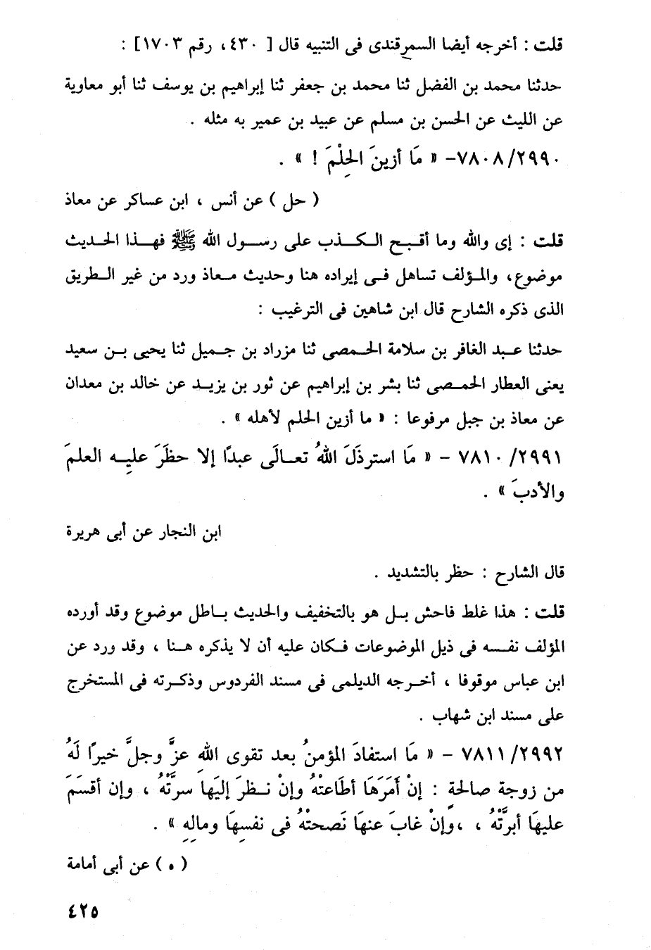 حدثنا عبد الغافر بن سلامة الحمصى ثنا مزراد بن جميل ثنا يحيى بن سعيد يعنى العطار الحمصى ثنا بشر بن إبراهيم عن ثور بن يزيد عن خالد بن معدان عن معاذ بن جبل مرفوعًا: "ما أزين الحلم لأهله".