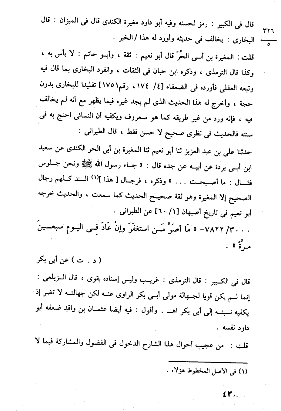 قلت: المغيرة بن أبي الحُرّ قال أبو نعيم: ثقة، وأبو حاتم: لا بأس به، وكذا قال الترمذى، وذكره ابن حبان في الثقات، وانفرد البخارى بما قال فيه وتبعه العقلى فأورده في الضعفاء [4/ 174، رقم 1751] تقليدا للبخارى بدون حجة، وأخرج له هذا الحديث الذي لم يجد غيره فيما يظهر مع أنه لم يخالف فيه، فإنه ورد من غير طريقه كما هو معروف ويكفيه أن النسائى احتج به في سننه فالحديث في نظرى صحيح لا حسن فقط، قال الطبرانى: