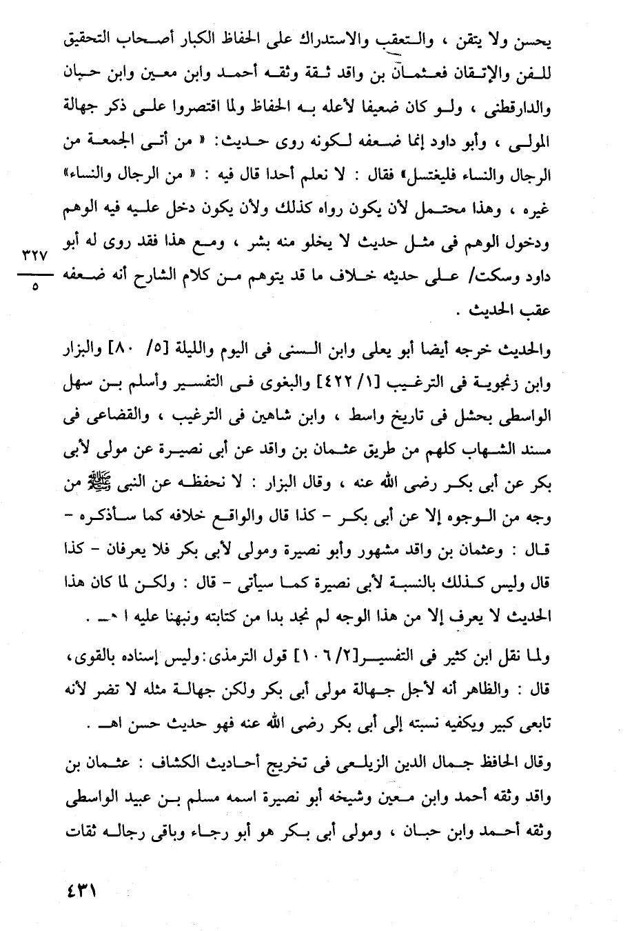 وقال الحافظ جمال الدين الزيلعى في تخريج أحاديث الكشاف: عثمان بن واقد وثقه أحمد وابن معين وشيخه أبو نصيرة اسمه مسلم بن عبيد الواسطى وثقه أحمد وابن حبان، ومولى أبي بكر هو أبو رجاء وباقى رجاله ثقات