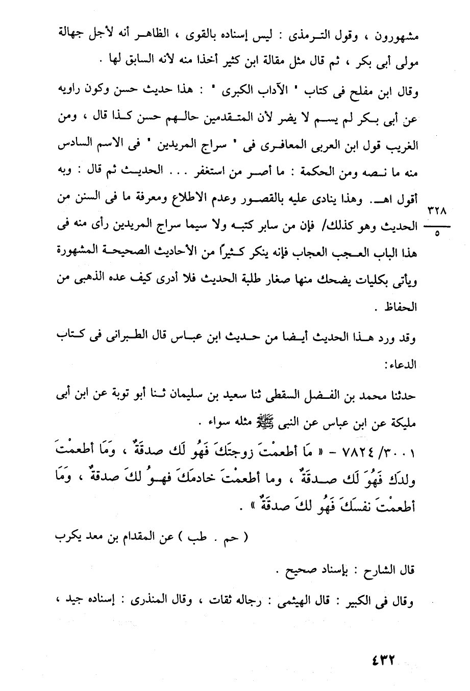 وقال ابن مفلح في كتاب "الآداب الكبرى": هذا حديث حسن وكون راويه عن أبي بكر لم يسم لا يضر لأن المتقدمين حالهم حسن كذا قال، ومن الغريب قول ابن العربى المعافرى في "سراج المريدين" في الاسم السادس منه ما نصه ومن الحكمة: ما أصر من استغفر. . . الحديث ثم قال: وبه أقول اهـ. وهذا ينادى عليه بالقصور وعدم الاطلاع ومعرفة ما في السنن من الحديث وهو كذلك فإن من سابر كتبه ولا سيما سراج المريدين رأى منه في هذا الباب العجب العجاب فإنه ينكر كثيرًا من الأحاديث الصحيحة المشهورة ويأتى بكليات يضحك منها صغار طلحة الحديث فلا أدرى كيف عده الذهبى من الحفاظ.