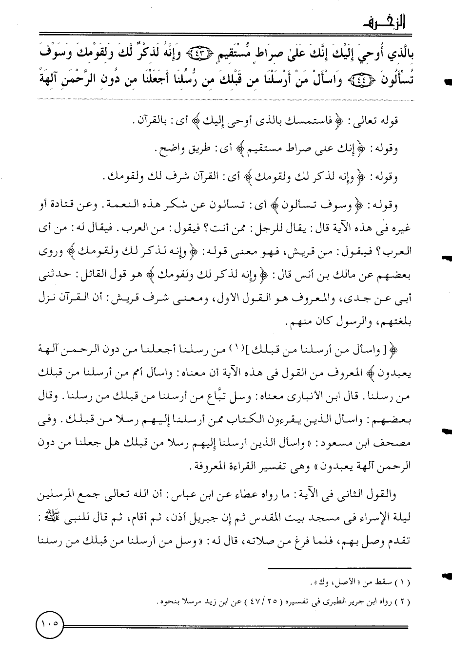 { [واسأل من أرسلنَا من قبلك] من رسلنَا أجعلنا من دون الرَّحْمَن آلِهَة يعْبدُونَ} الْمَعْرُوف من القَوْل فِي هَذِه الْآيَة أَن مَعْنَاهُ: واسأل أُمَم من أرسلنَا من قبلك من رسلنَا. قَالَ ابْن الْأَنْبَارِي مَعْنَاهُ: وسل تبَاع من أرسلنَا من قبلك من رسلنَا. وَقَالَ بَعضهم: واسأل الَّذين يقرءُون الْكتاب مِمَّن أرسلنَا إِلَيْهِم رسلًا من قبلك. وَفِي مصحف ابْن مَسْعُود: " واسال الَّذين أرسلنَا إِلَيْهِم رسلًا من قبلك هَل جعلنَا من دون الرَّحْمَن آلِهَة يعْبدُونَ " وَهِي تَفْسِير الْقِرَاءَة الْمَعْرُوفَة.