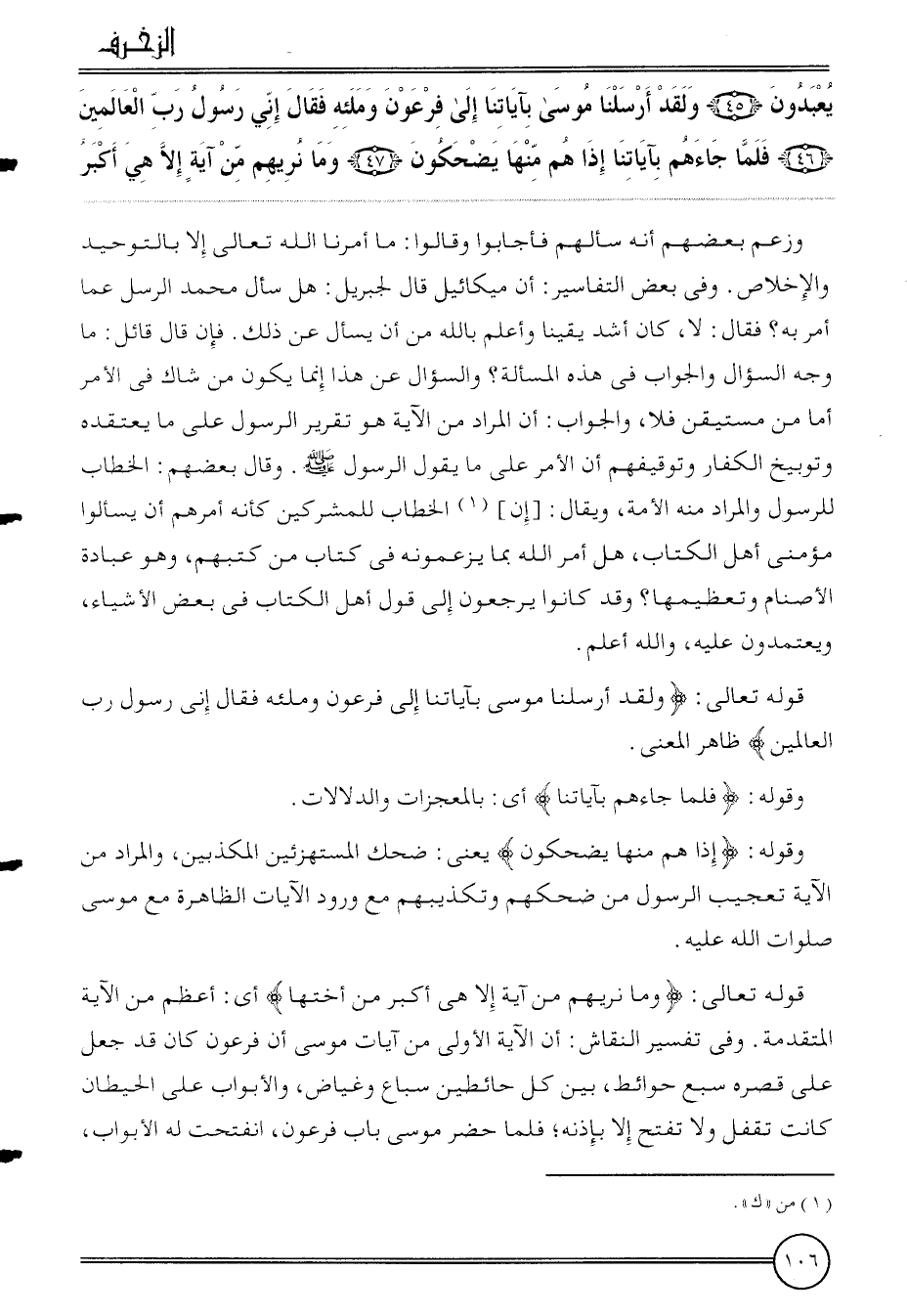 {يعْبدُونَ (45) وَلَقَد أرسلنَا مُوسَى بِآيَاتِنَا إِلَى فِرْعَوْن وملئه فَقَالَ إِنِّي رَسُول رب الْعَالمين (46) فَلَمَّا جَاءَهُم بِآيَاتِنَا إِذا هم مِنْهَا يَضْحَكُونَ (47) وَمَا نريهم من آيَة إِلَّا هِيَ أكبر} وَزعم بَعضهم أَنه سَأَلَهُمْ فَأَجَابُوا وَقَالُوا: مَا أمرنَا الله تَعَالَى إِلَّا بِالتَّوْحِيدِ وَالْإِخْلَاص. وَفِي بعض التفاسير: أَن مِيكَائِيل قَالَ لجبريل: هَل سَأَلَ مُحَمَّد الرُّسُل عَمَّا أَمر بِهِ؟ فَقَالَ: لَا، كَانَ أَشد يَقِينا وَأعلم بِاللَّه من أَن يسال عَن ذَلِك. فَإِن قَالَ قَائِل: مَا وَجه السُّؤَال وَالْجَوَاب فِي هَذِه المسالة؟ وَالسُّؤَال عَن هَذَا إِنَّمَا يكون من شَاك فِي الْأَمر أما من مستقين فَلَا، وَالْجَوَاب: أَن المُرَاد من الْآيَة هُوَ تَقْرِير الرَّسُول على مَا يَعْتَقِدهُ وتوبيخ الْكفَّار وتوقيفهم أَن الْأَمر على مَا يَقُول الرَّسُول. وَقَالَ بَعضهم: الْخطاب للرسول وَالْمرَاد مِنْهُ الْأمة، وَيُقَال: [إِن] الْخطاب للْمُشْرِكين كَأَنَّهُ أَمرهم أَن يسْأَلُوا مؤمني أهل الْكتاب، هَل أَمر الله بِمَا يزعمونه فِي كتاب من كتبهمْ، وَهُوَ عبَادَة الْأَصْنَام وتعظيمها؟ وَقد كَانُوا يرجعُونَ إِلَى قَول أهل الْكتاب فِي بعض الْأَشْيَاء، ويعتمدون عَلَيْهِ، وَالله أعلم.
