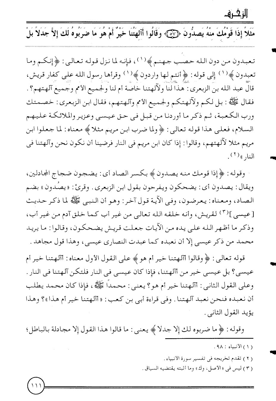 {مثلا إِذا قَوْمك مِنْهُ يصدون (57) وَقَالُوا أآلهتنا خير أم هُوَ مَا ضربوه لَك إِلَّا جدلا بل} تَعْبدُونَ من دون الله حصب جَهَنَّم) ، فَإِنَّهُ لما نزل قَوْله تَعَالَى: {إِنَّكُم وَمَا تَعْبدُونَ} إِلَى قَوْله: {أَنْتُم لَهُ وَارِدُونَ} وَقرأَهَا رَسُول الله على كفار قُرَيْش، قَالَ عبد الله بن الزبعري: هَذَا لنا ولآلهتنا خَاصَّة أم لنا وَلِجَمِيعِ الْأُمَم وآلهتهم؟ . فَقَالَ: بل لكم ولآلهتكم وَلِجَمِيعِ الْأُمَم وآلهتهم، فَقَالَ ابْن الزعبري: خصمتك وَرب الْكَعْبَة، ثمَّ ذكر مَا أوردنا من قبل فِي حق عِيسَى وعزيز وَالْمَلَائِكَة عَلَيْهِم السَّلَام، فعلى هَذَا قَوْله تَعَالَى: {وَلما ضرب ابْن مَرْيَم مثلا} مَعْنَاهُ: لما جعلُوا ابْن مَرْيَم مثلا لآلهتهم، وَقَالُوا: إِذا كَانَ ابْن مَرْيَم فِي النَّار فرضينا أَن نَكُون نَحن وَآلِهَتنَا فِي النَّار ".