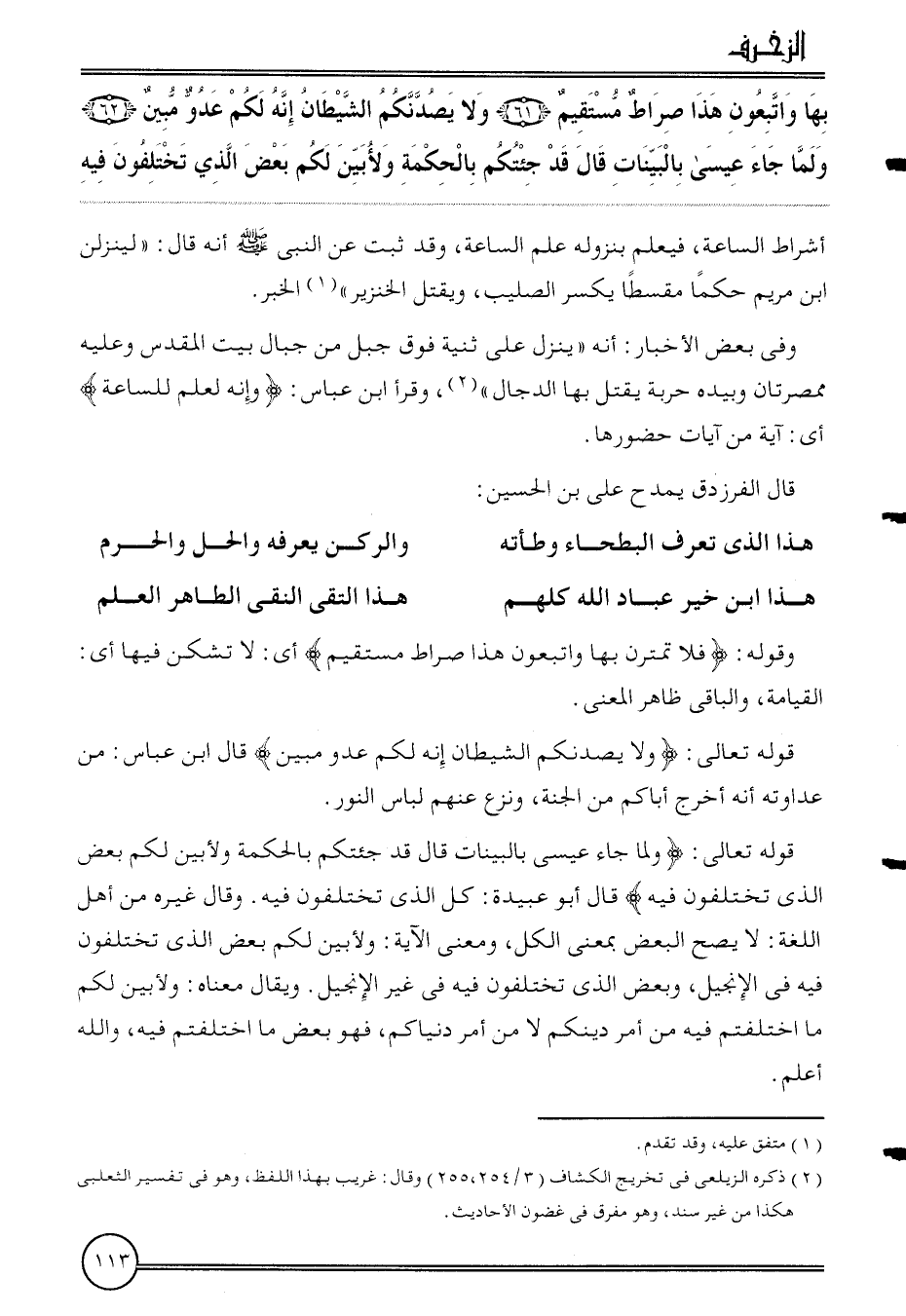 {بهَا واتبعون هَذَا صِرَاط مُسْتَقِيم (61) وَلَا يصدنكم الشَّيْطَان إِنَّه لكم عَدو مُبين (62) وَلما جَاءَ عِيسَى بلبينات قَالَ قد جِئتُكُمْ بالحكمة ولأبين لكم بعض الَّذِي تختلفون فِيهِ} أَشْرَاط السَّاعَة، فَيعلم بنزوله علم السَّاعَة، وَقد ثَبت عَن النَّبِي أَنه قَالَ: " لينزلن ابْن مَرْيَم حكما مقسطا يكسر الصَّلِيب، وَيقتل الْخِنْزِير ". الْخَبَر.