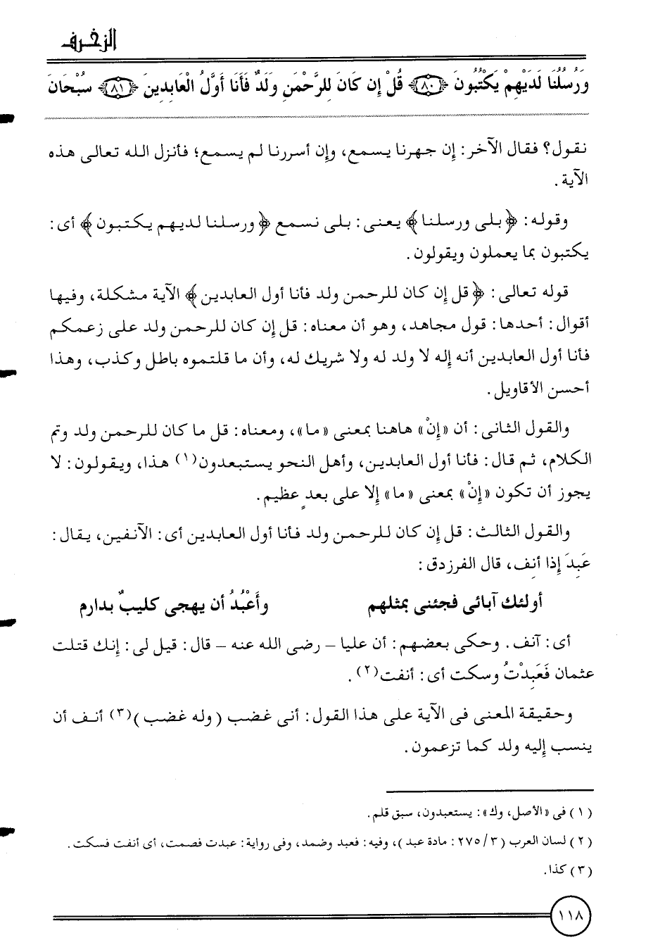 وَالْقَوْل الثَّالِث: قل إِن كَانَ للرحمن ولد فَأَنا أول العابدين أَي: الآنفين، يُقَال: عبد إِذا أنف، قَالَ الفرزدق: