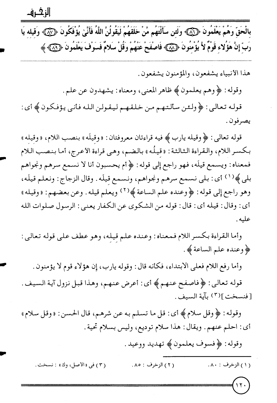 {بِالْحَقِّ وهم يعلمُونَ (86) وَلَئِن سَأَلتهمْ من خلقهمْ ليَقُولن الله فَأنى يؤفكون (87) وقيله يَا رب إِن هَؤُلَاءِ قوم لَا يُؤمنُونَ (88) فاصفح عَنْهُم وَقل سَلام فَسَوف يعلمُونَ (89) } هَذَا الْأَنْبِيَاء يشفعون، والمؤمنون يشفعون.