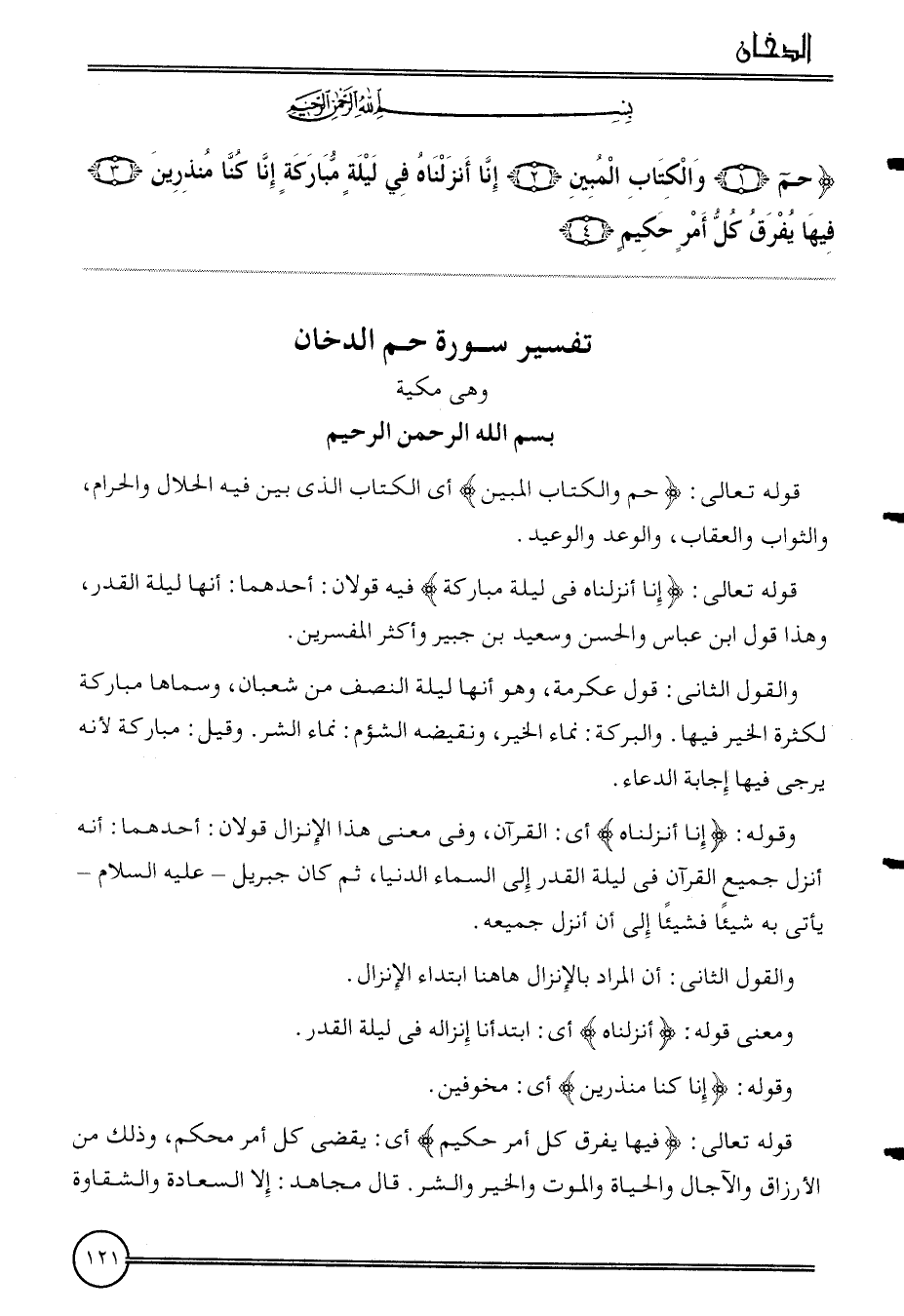 {حم (1) وَالْكتاب الْمُبين (2) إِنَّا أَنزَلْنَاهُ فِي لَيْلَة مباركة إِنَّا كُنَّا منذرين (3) فِيهَا يفرق كل أَمر حَكِيم (4) }