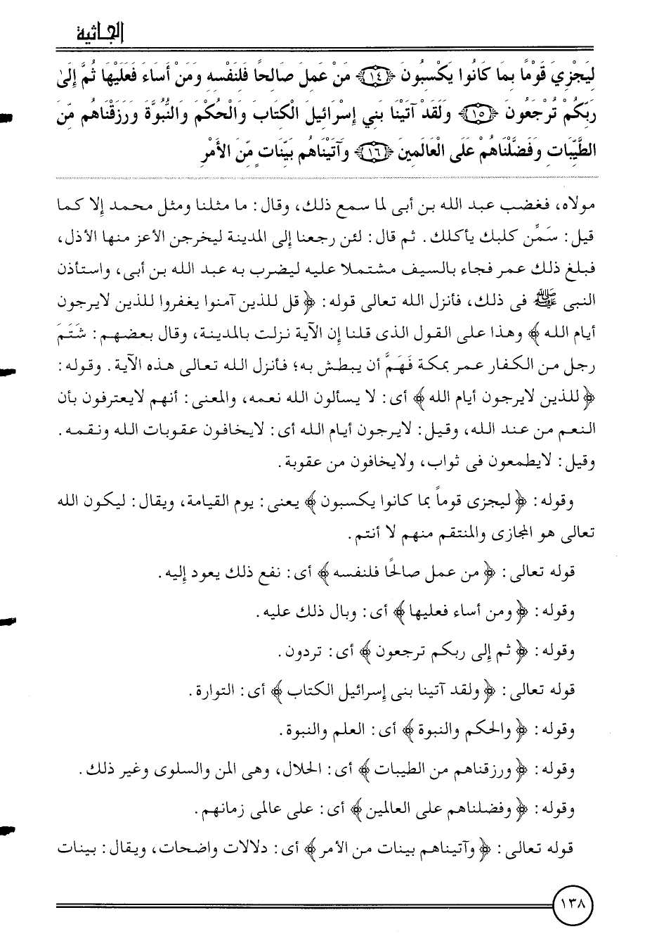 {ليجزي قوما بِمَا كَانُوا يَكْسِبُونَ (14) من عمل صَالحا فلنفسه وَمن أَسَاءَ فعلَيْهَا ثمَّ إِلَى ربكُم ترجعون (15) وَلَقَد آتَيْنَا بني إِسْرَائِيل الْكتاب وَالْحكم والنبوة ورزقناهم من الطَّيِّبَات وفضلناهم على الْعَالمين (16) وآتيناهم بَيِّنَات من الْأَمر} مَوْلَاهُ، فَغَضب عبد الله بن أبي لما سمع ذَلِك، وَقَالَ: مَا مثلنَا وَمثل مُحَمَّد إِلَّا كَمَا قيل: سمن كلبك يَأْكُلك. ثمَّ قَالَ: لَئِن رَجعْنَا إِلَى الْمَدِينَة ليخرجن الْأَعَز مِنْهَا الْأَذَل، فَبلغ ذَلِك عمر فجَاء بِالسَّيْفِ مُشْتَمِلًا عَلَيْهِ ليضْرب بِهِ عبد الله بن أبي، وَاسْتَأْذَنَ النَّبِي فِي ذَلِك، فَأنْزل الله تَعَالَى قَوْله: {قل للَّذين آمنُوا يغفروا للَّذين لَا يرجون أَيَّام الله} وَهَذَا على القَوْل الَّذِي قُلْنَا إِن الْآيَة نزلت بِالْمَدِينَةِ، وَقَالَ بَعضهم: شتم رجل من الْكفَّار عمر بِمَكَّة فهم أَن يبطش بِهِ؛ فَأنْزل الله تَعَالَى هَذِه الْآيَة.