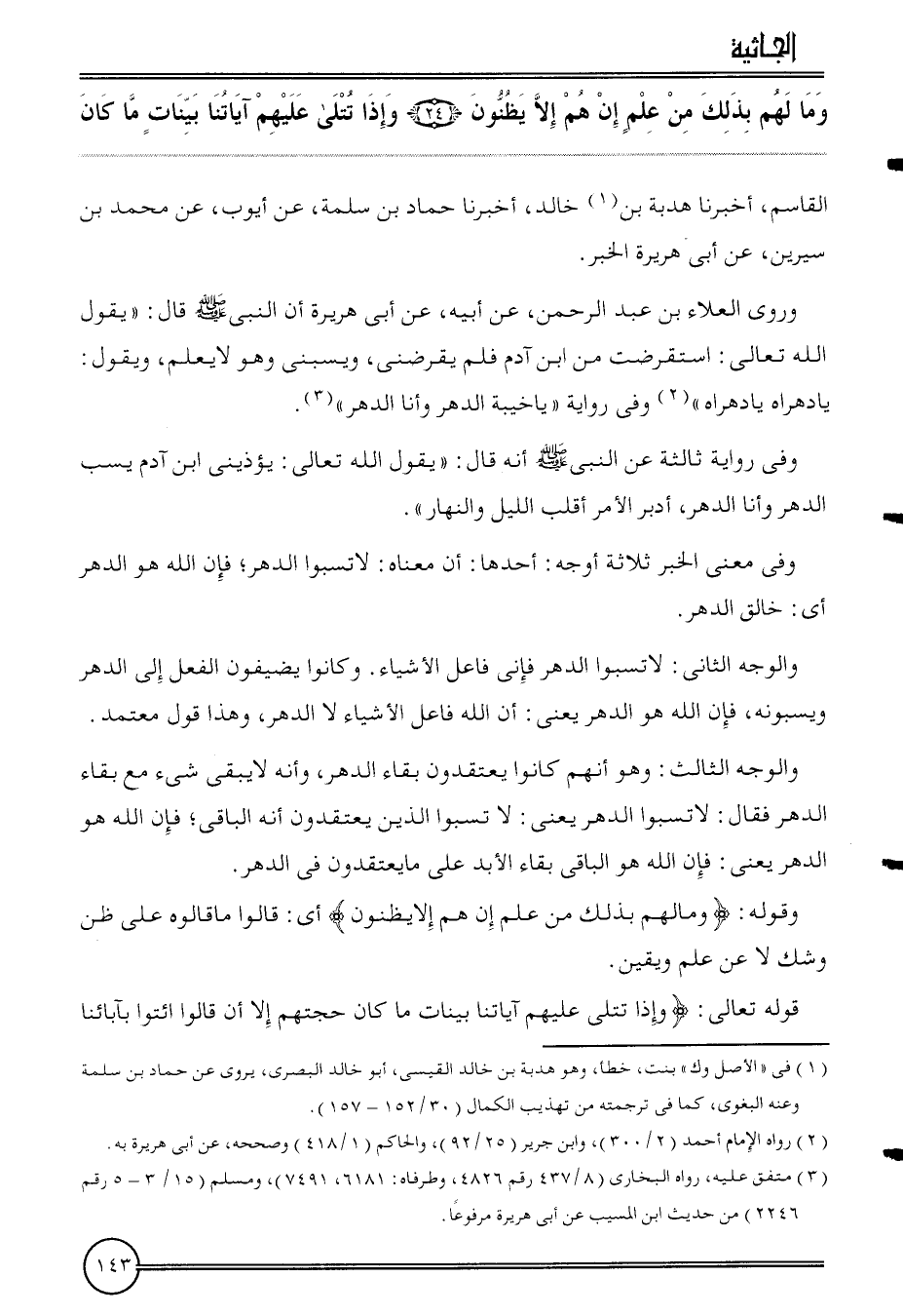 {وَمَا لَهُم بذلك من علم إِن هم إِلَّا يظنون (24) وَإِذا تتلى عَلَيْهِم آيَاتنَا بَيِّنَات مَا كَانَ} الْقَاسِم، أخبرنَا هدبة بن خَالِد، أخبرنَا حَمَّاد بن سَلمَة، عَن أَيُّوب، عَن مُحَمَّد بن سِيرِين، عَن أبي هُرَيْرَة الْخَبَر.