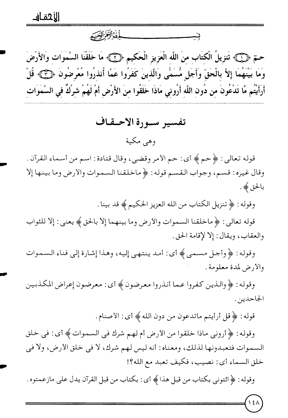 {حم (1) تَنْزِيل الْكتاب من الله الْعَزِيز الْحَكِيم (2) مَا خلقنَا السَّمَوَات وَالْأَرْض وَمَا بَينهمَا إِلَّا بِالْحَقِّ وَأجل مُسَمّى وَالَّذين كفرُوا عَمَّا أنذروا معرضون (3) قل أَرَأَيْتُم مَا تدعون من دون الله أروني مَاذَا خلقُوا من الأَرْض أم لَهُم شرك فِي السَّمَوَات}