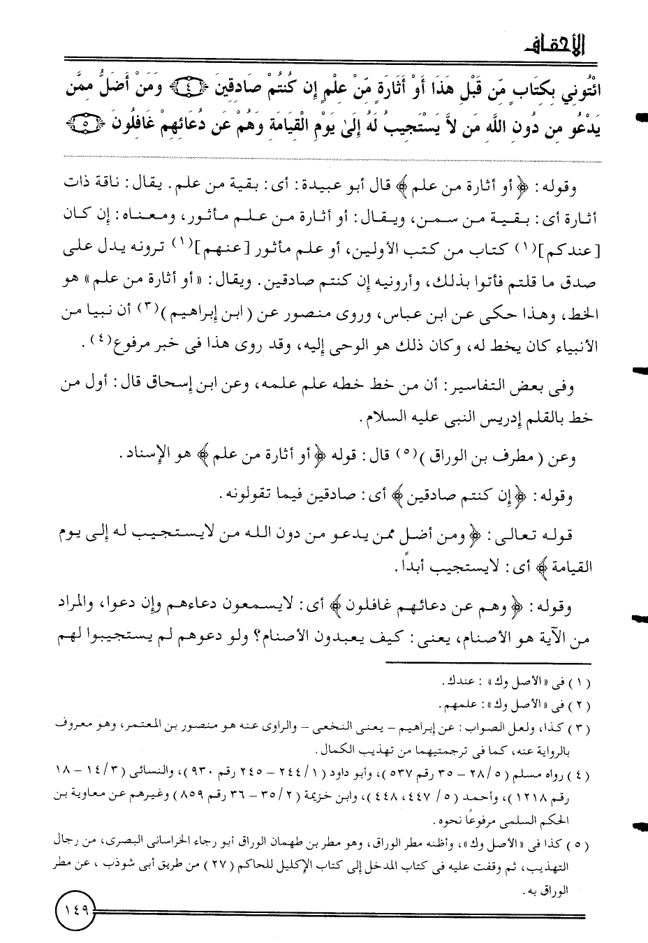 {ائْتُونِي بِكِتَاب من قبل هَذَا أَو أثارة من علم إِن كُنْتُم صَادِقين (4) وَمن أضلّ مِمَّن يَدْعُو من دون الله من لَا يستجيب لَهُ إِلَى يَوْم الْقِيَامَة وهم عَن دُعَائِهِمْ غافلون (5) }