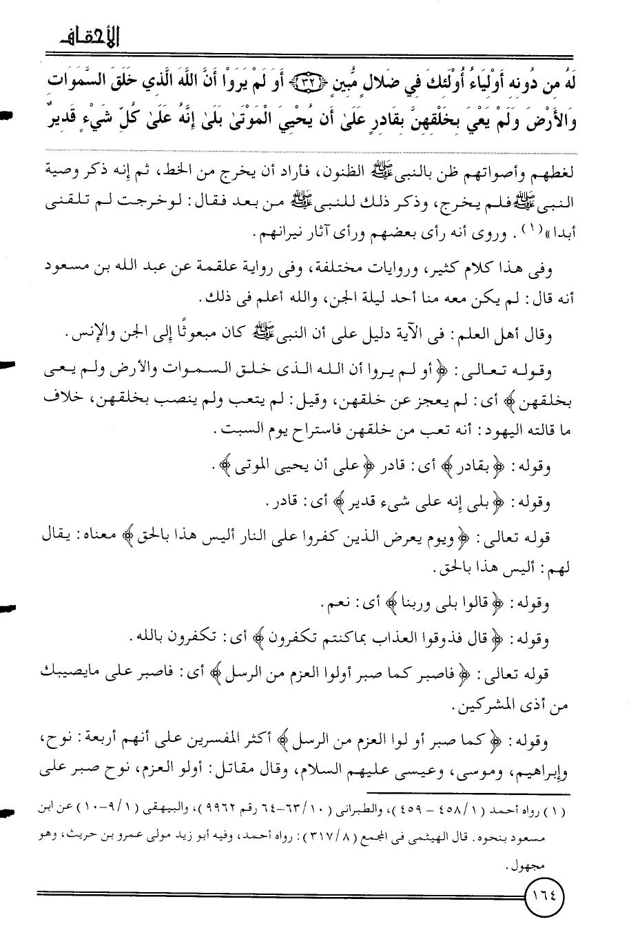 وَقَوله: {كَمَا صَبر أولُوا الْعَزْم من الرُّسُل} أَكثر الْمُفَسّرين على أَنهم أَرْبَعَة: نوح، وَإِبْرَاهِيم، ومُوسَى، وَعِيسَى عَلَيْهِم السَّلَام، وَقَالَ مقَاتل: أولُوا الْعَزْم، نوح صَبر على