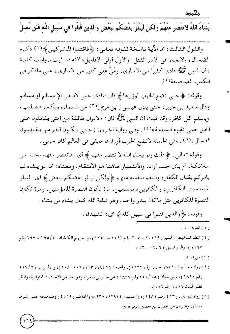 وَقَوله: {حَتَّى تضع الْحَرْب أَوزَارهَا} قَالَ قَتَادَة: حَتَّى لَا يبْقى إِلَّا مُسلم أَو مسالم وَقَالَ سعيد بن جُبَير: حَتَّى ينزل عِيسَى [ابْن مَرْيَم] من السَّمَاء، وَيكسر الصَّلِيب، وَيسلم كل كَافِر. وَقد ثَبت أَن النَّبِي قَالَ: " لَا تزَال طَائِفَة من أمتِي يُقَاتلُون على الْحق حَتَّى تقوم السَّاعَة ". وَفِي رِوَايَة أُخْرَى: " حَتَّى يكون آخر من يُقَاتلُون الدَّجَّال ". وَفِي الْجُمْلَة لَا تضع الْحَرْب أَوزَارهَا مَا بَقِي فِي الْعَالم كَافِر حَرْبِيّ.