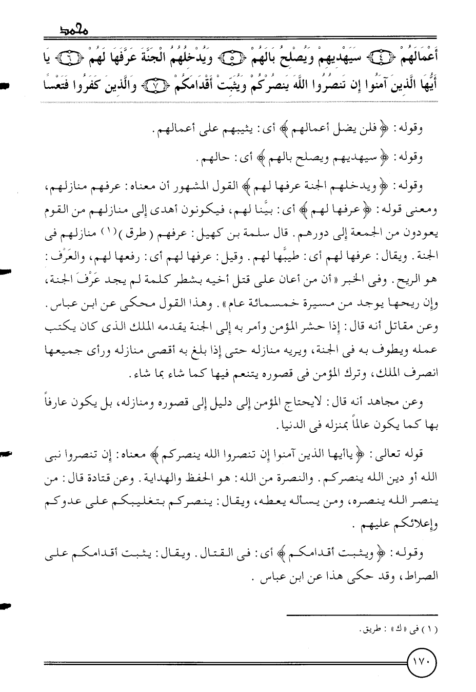 {أَعْمَالهم (4) سيهديهم وَيصْلح بالهم (5) ويدخلهم الْجنَّة عرفهَا لَهُم (6) يَا أَيهَا الَّذين آمنُوا إِن تنصرُوا الله ينصركم وَيثبت أقدامكم (7) وَالَّذين كفرُوا فتعسا}