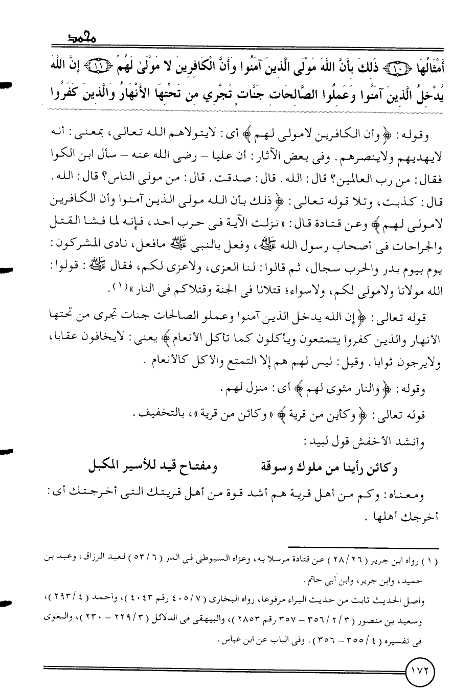{أَمْثَالهَا (10) ذَلِك بِأَن الله مولى الَّذين آمنُوا وَأَن الْكَافرين لَا مولى لَهُم (11) إِن الله يدْخل الَّذين آمنُوا وَعمِلُوا الصَّالِحَات جنَّات تجْرِي من تختها الْأَنْهَار وَالَّذين كفرُوا}