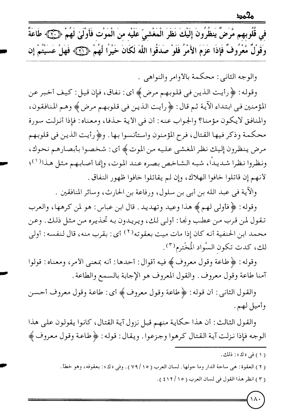 {فِي قُلُوبهم مرض ينظرُونَ إِلَيْك نظر المغشي عَلَيْهِ من الْمَوْت فَأولى لَهُم (20) طَاعَة وَقَول مَعْرُوف فَإِذا عزم الْأَمر فَلَو صدقُوا الله لَكَانَ خيرا لَهُم (21) فَهَل عسيتم إِن}