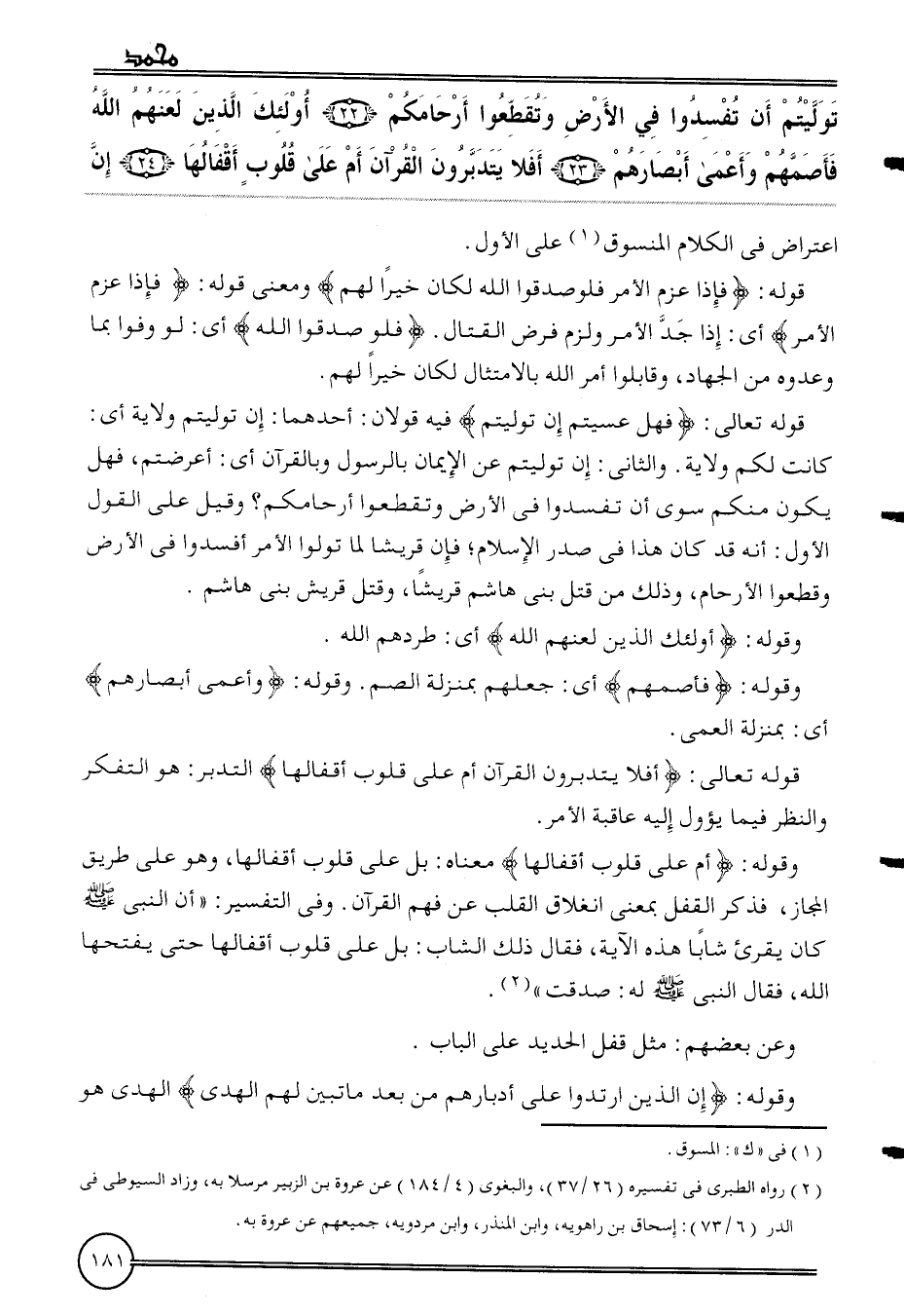 {توليتم أَن تفسدوا فِي الأَرْض وتقطعوا أَرْحَامكُم (22) أُولَئِكَ الَّذين لعنهم الله فأصمهم وأعمى أَبْصَارهم (23) أَفلا يتدبرون الْقُرْآن أم على قُلُوب أقفالها (24) إِن} اعْتِرَاض فِي الْكَلَام المنسوق على الأول.