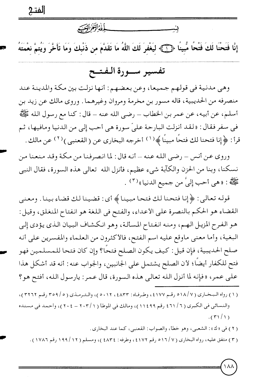 وَهِي مَدَنِيَّة فِي قَوْلهم جَمِيعًا، وَعَن بَعضهم: انها نزلت بَين مَكَّة وَالْمَدينَة عِنْد مُنْصَرفه من الْحُدَيْبِيَة، قَالَه مسور بن مخرمَة ومروان وَغَيرهمَا. وروى مَالك عَن زيد بن أسلم، عَن ابيه، عَن عمر بن الْخطاب رَضِي الله عَنهُ قَالَ: كُنَّا مَعَ رَسُول الله فِي سفر فَقَالَ: " لقد انزلت البارحة عَليّ سُورَة هِيَ أحب إِلَيّ من الدُّنْيَا وَمَا فِيهَا، ثمَّ قَرَأَ: {إِنَّا فتحنا لَك فتحا مُبينًا} أخرجه البُخَارِيّ عَن (القعْنبِي) عَن مَالك.