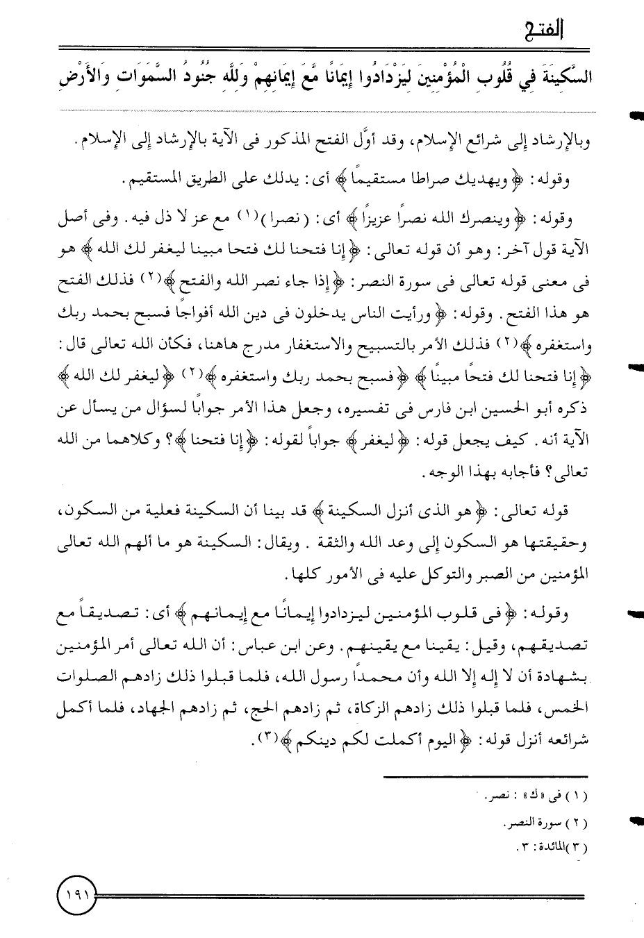 {السكينَة فِي قُلُوب الْمُؤمنِينَ ليزدادوا إِيمَانًا مَعَ إِيمَانهم وَللَّه جنود السَّمَوَات وَالْأَرْض} وبالإرشاد إِلَى شرائع الْإِسْلَام، وَقد أول الْفَتْح الْمَذْكُور فِي الْآيَة بالإرشاد إِلَى الْإِسْلَام.