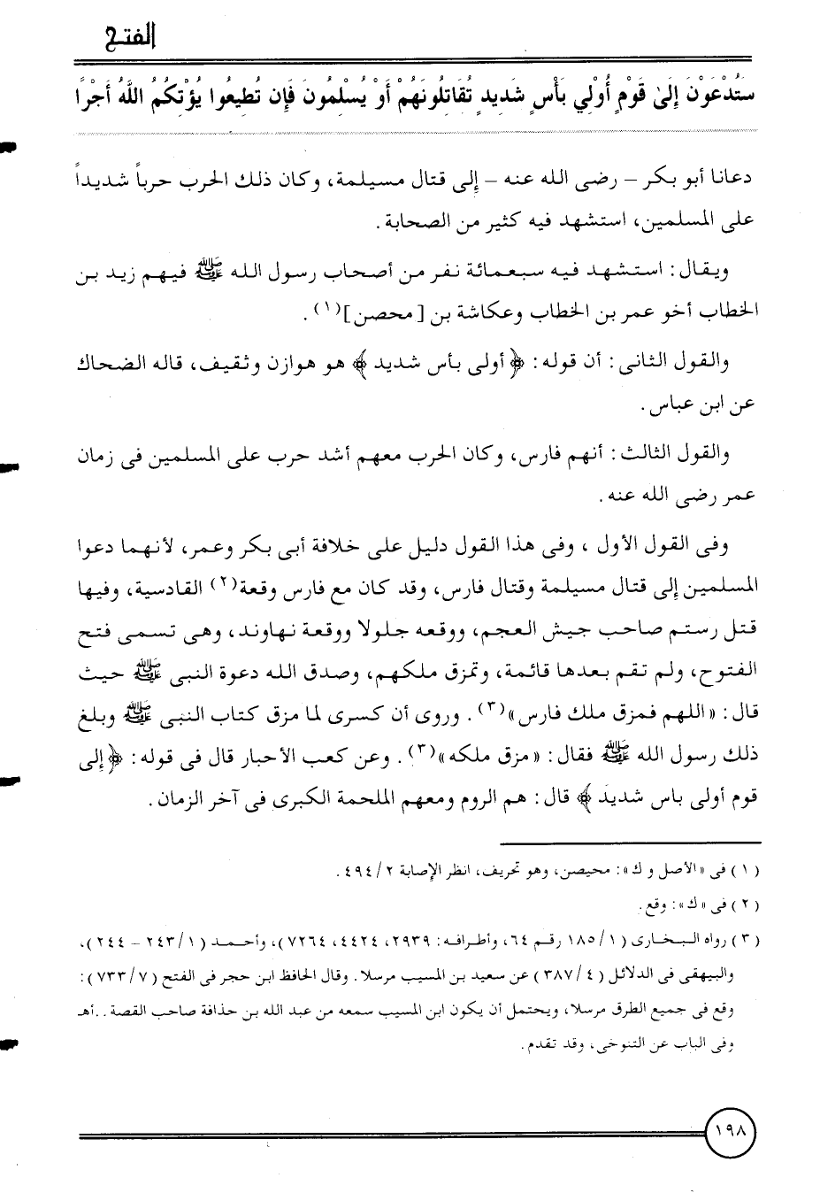 وَفِي القَوْل الأول، وَفِي هَذَا القَوْل دَلِيل على خلَافَة ابي بكر وَعمر، لِأَنَّهُمَا دعوا الْمُسلمين إِلَى قتال مُسَيْلمَة وقتال فَارس، وَقد كَانَ مَعَ فَارس وقْعَة الْقَادِسِيَّة، وفيهَا قتل رستم صَاحب جَيش الْعَجم، ووقعة جلولا ووقعة نهاوند، وَهِي تسمى فتح الْفتُوح، وَلم تقم بعْدهَا قَائِمَة، وتمزق ملكهم، وَصدق الله دَعْوَة النَّبِي حَيْثُ قَالَ: " اللَّهُمَّ فمزق ملك فَارس ". وَرُوِيَ أَن أَن كسْرَى لما مزق كتاب النَّبِي وَبلغ ذَلِك رَسُول الله فَقَالَ: " مزق ملكه ". وَعَن كَعْب الْأَحْبَار قَالَ فِي قَوْله: {إِلَى قوم أولي بَأْس شَدِيد} قَالَ: هم الرّوم وَمَعَهُمْ الملحمة الْكُبْرَى فِي آخر الزَّمَان.