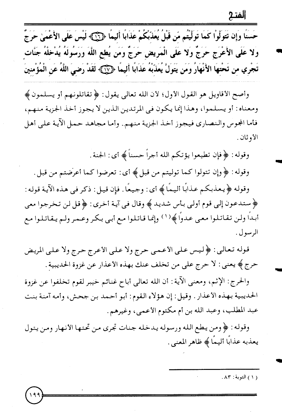{حسنا وَإِن تَتَوَلَّوْا كَمَا توليتم من قبل يعذبكم عذَابا أَلِيمًا (16) لَيْسَ على الْأَعْمَى حرج وَلَا على الْأَعْرَج حرج وَلَا على الْمَرِيض حرج وَمن يطع الله وَرَسُوله يدْخلهُ جنَّات تجْرِي من تحتهَا الْأَنْهَار وَمن يتول يعذبه عذَابا أَلِيمًا (17) لقد رَضِي الله عَن الْمُؤمنِينَ}