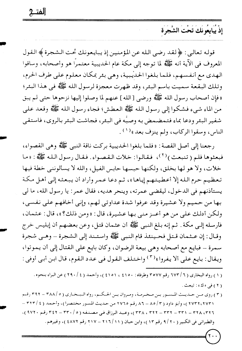 قَوْله تَعَالَى: {لقد رَضِي الله عَن الْمُؤمنِينَ إِذْ يُبَايعُونَك تَحت الشَّجَرَة} القَوْل الْمَعْرُوف فِي الْآيَة أَنه لما توجه إِلَى مَكَّة عَام الْحُدَيْبِيَة مُعْتَمِرًا هُوَ وَأَصْحَابه، وَسَاقُوا الْهَدْي مَعَ أنفسهم، فَلَمَّا بلغُوا الْحُدَيْبِيَة، وَهِي بِئْر بمَكَان مَعْلُوم على طرف الْحرم، وَتلك الْبقْعَة سميت باسم الْبِئْر، وَقد ظَهرت معْجزَة لرَسُول الله فِي هَذَا الْبِئْر؛ " فَإِن أَصْحَاب رَسُول الله وَرَضي [الله] عَنْهُم لما وصلوا إِلَيْهَا نزحوها حَتَّى لم يبْق من المَاء شَيْء فشكوا إِلَى رَسُول الله الْعَطش؛ فجَاء رَسُول الله وَقعد على شَفير الْبِئْر ودعا بِمَاء فَتَمَضْمَض بِهِ وصبه فِي الْبِئْر، فَجَاشَتْ الْبِئْر بالروى، فاستقى النَّاس، وَسقوا الركاب، وَلم ينزف بعد ".