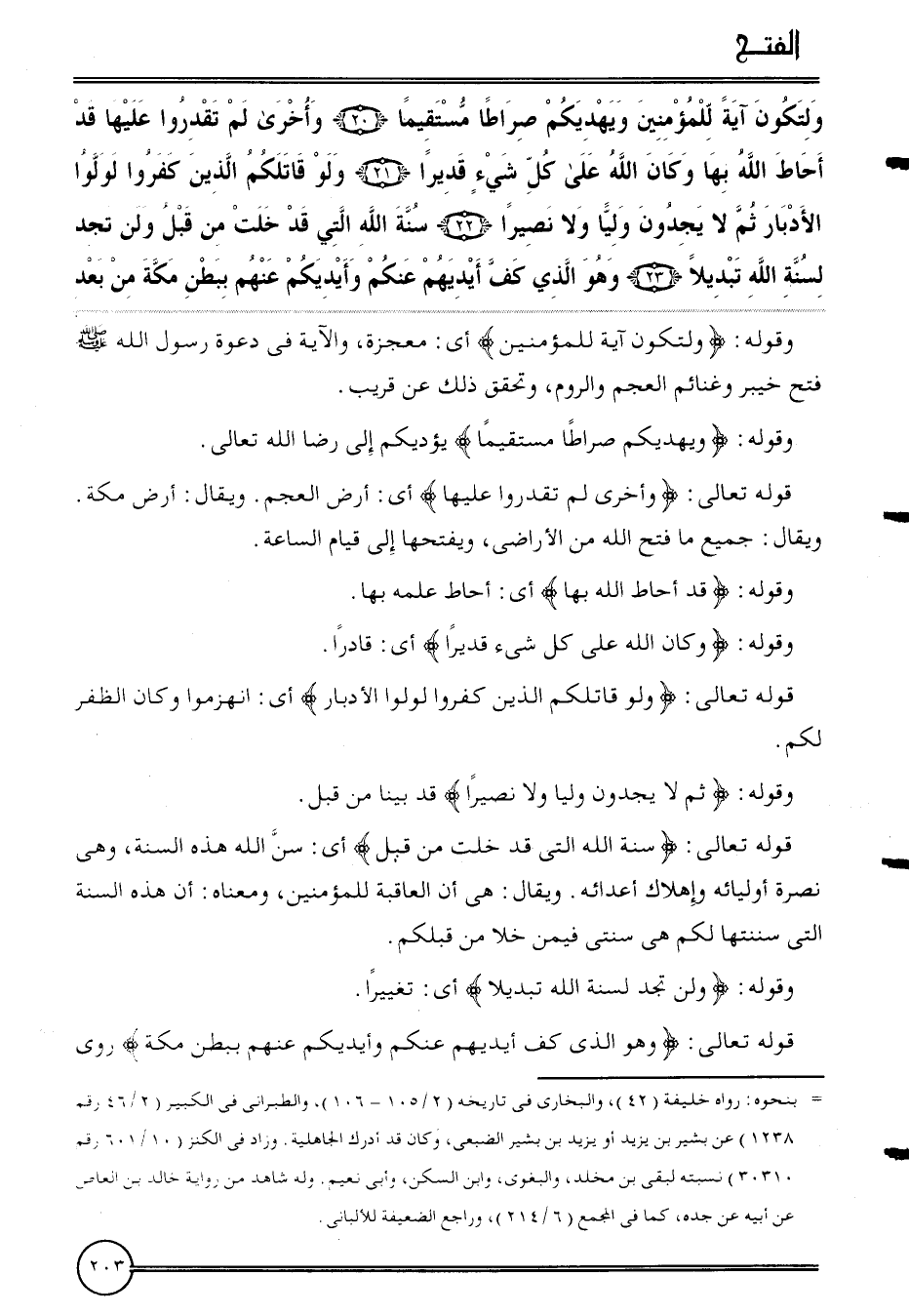 {ولتكون آيَة للْمُؤْمِنين وَيهْدِيكُمْ صراطا مُسْتَقِيمًا (20) وَأُخْرَى لم تقدروا عَلَيْهَا قد احاط الله بهَا وَكَانَ الله على كل شَيْء قَدِيرًا (21) وَلَو قاتلكم الَّذين كفرُوا لولوا الأدبار ثمَّ لَا يَجدونَ وليا وَلَا نَصِيرًا (22) سنة الله الَّتِي قد خلت من قبل وَلنْ تَجِد لسنة الله تبديلا (23) وَهُوَ الَّذِي كف أَيْديهم عَنْكُم وَأَيْدِيكُمْ عَنْهُم بِبَطن مَكَّة من بعد}