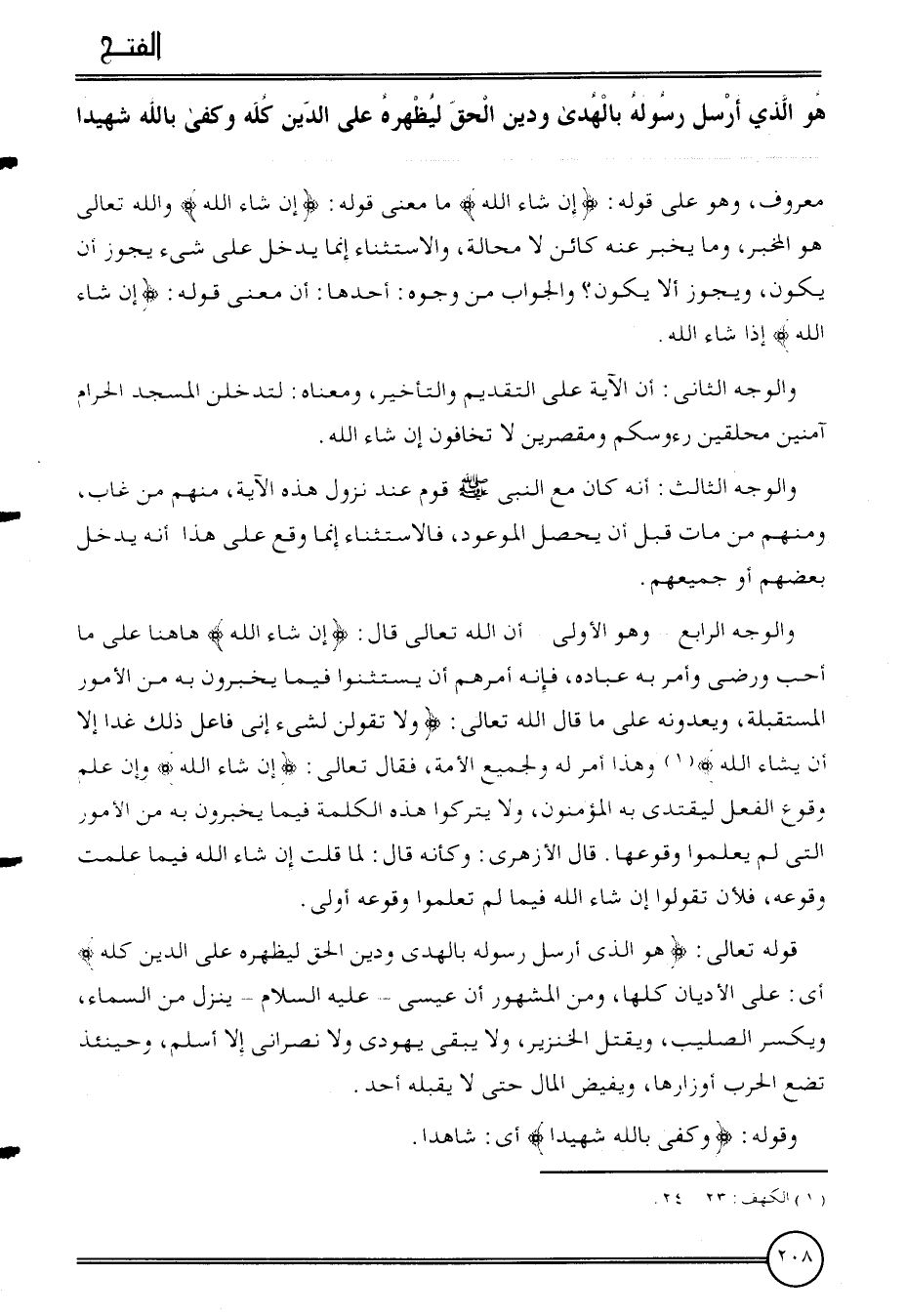 {هُوَ الَّذِي أرسل رَسُوله بِالْهدى وَدين الْحق لِيظْهرهُ على الدّين كُله وَكفى بِاللَّه شَهِيدا} مَعْرُوف، وَهُوَ على قَوْله: {إِن شَاءَ الله} مَا معنى قَوْله {إِن شَاءَ الله} وَالله تَعَالَى هُوَ الْمخبر، وَمَا يخبر عَنهُ كَائِن لَا محَالة، وَالِاسْتِثْنَاء إِنَّمَا يدْخل على شَيْء يجوز أَن يكون، وَيجوز أَلا يكون؟ وَالْجَوَاب من وُجُوه: أَحدهَا: أَن معنى قَوْله: {إِن شَاءَ الله} إِذا شَاءَ الله.