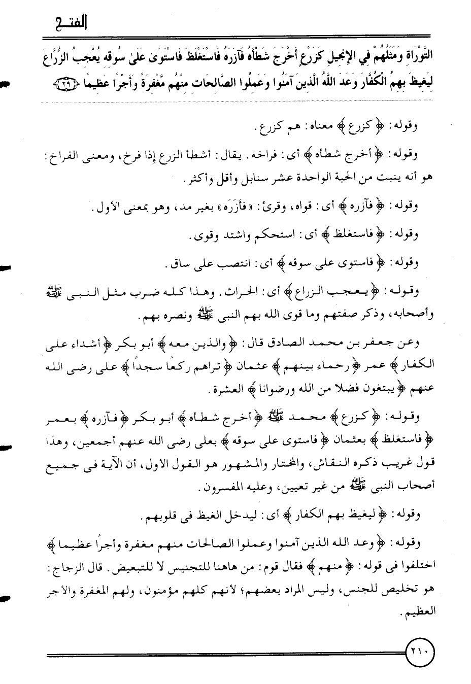 وَقَوله: {كزرع} مُحَمَّد {أخرج شطأه} أَبُو بكر {فآزره} بعمر {فاستغلظ} بعثمان {فَاسْتَوَى على سوقه} بعلي رَضِي الله عَنْهُم أَجْمَعِينَ، وَهَذَا قَول غَرِيب ذكره النقاش، وَالْمُخْتَار وَالْمَشْهُور هُوَ القَوْل الأول، أَن الْآيَة فِي جَمِيع أَصْحَاب النَّبِي من غير تعْيين، وَعَلِيهِ الْمُفَسِّرُونَ.