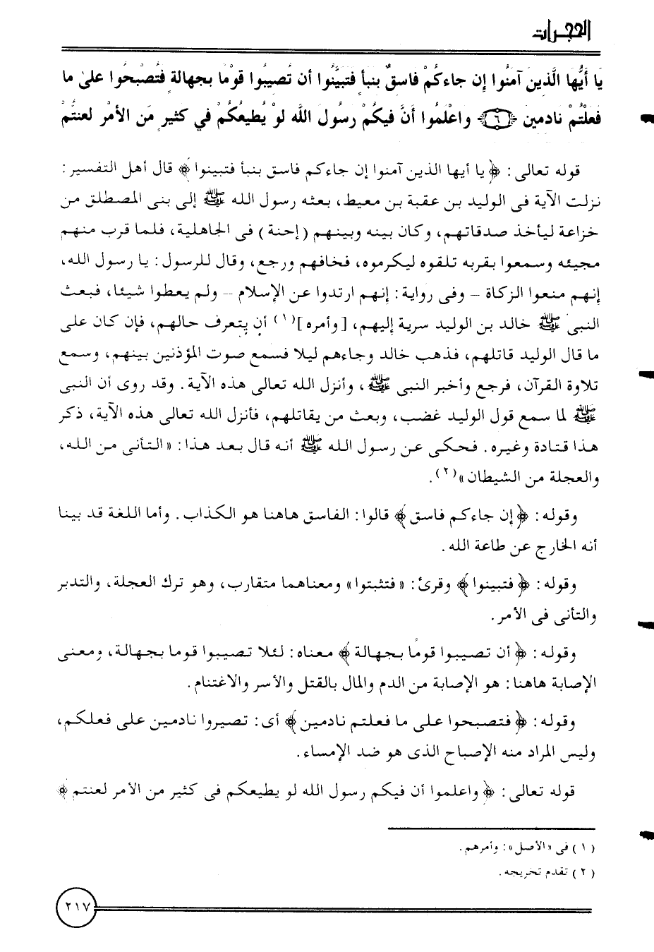 {يَا أَيهَا الَّذين آمنُوا إِن جَاءَكُم فَاسق بِنَبَأٍ فَتَبَيَّنُوا أَن تصيبوا قوما بِجَهَالَة فتصبحوا على مَا فَعلْتُمْ نادمين (6) وَاعْلَمُوا أَن فِيكُم رَسُول الله لَو يطيعكم فِي كثير من الْأَمر لعنتم}
