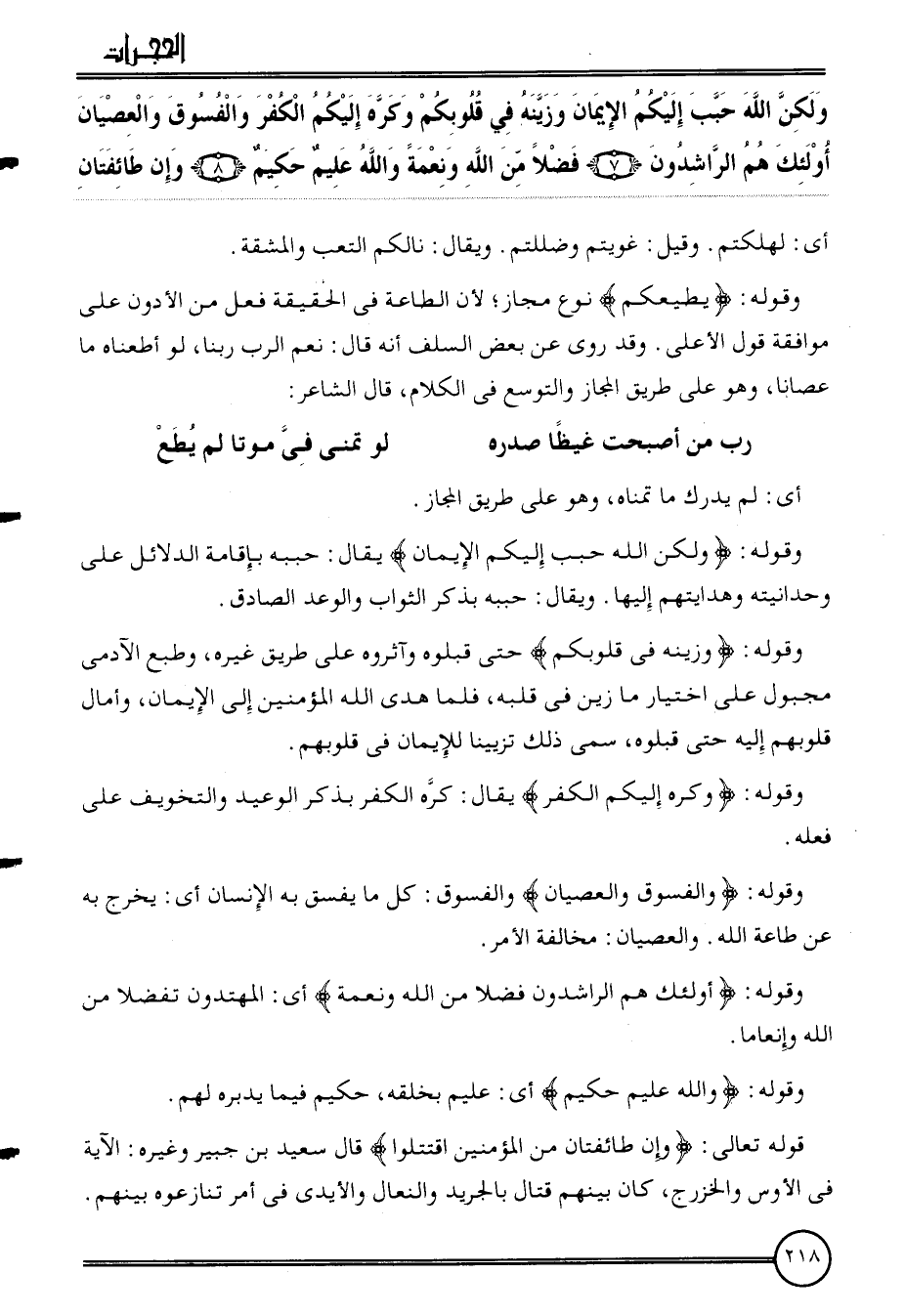 {وَلَكِن الله حبب إِلَيْكُم الْإِيمَان وزينه فِي قُلُوبكُمْ وَكره إِلَيْكُم الْكفْر والفسوق والعصيان أُولَئِكَ هم لراشدون (7) فضلا من الله ونعمة وَالله عليم حَكِيم (8) وَإِن طَائِفَتَانِ} أَي: لهلكتم. وَقيل: غويتم وضللتم. وَيُقَال: نالكم التَّعَب وَالْمَشَقَّة.