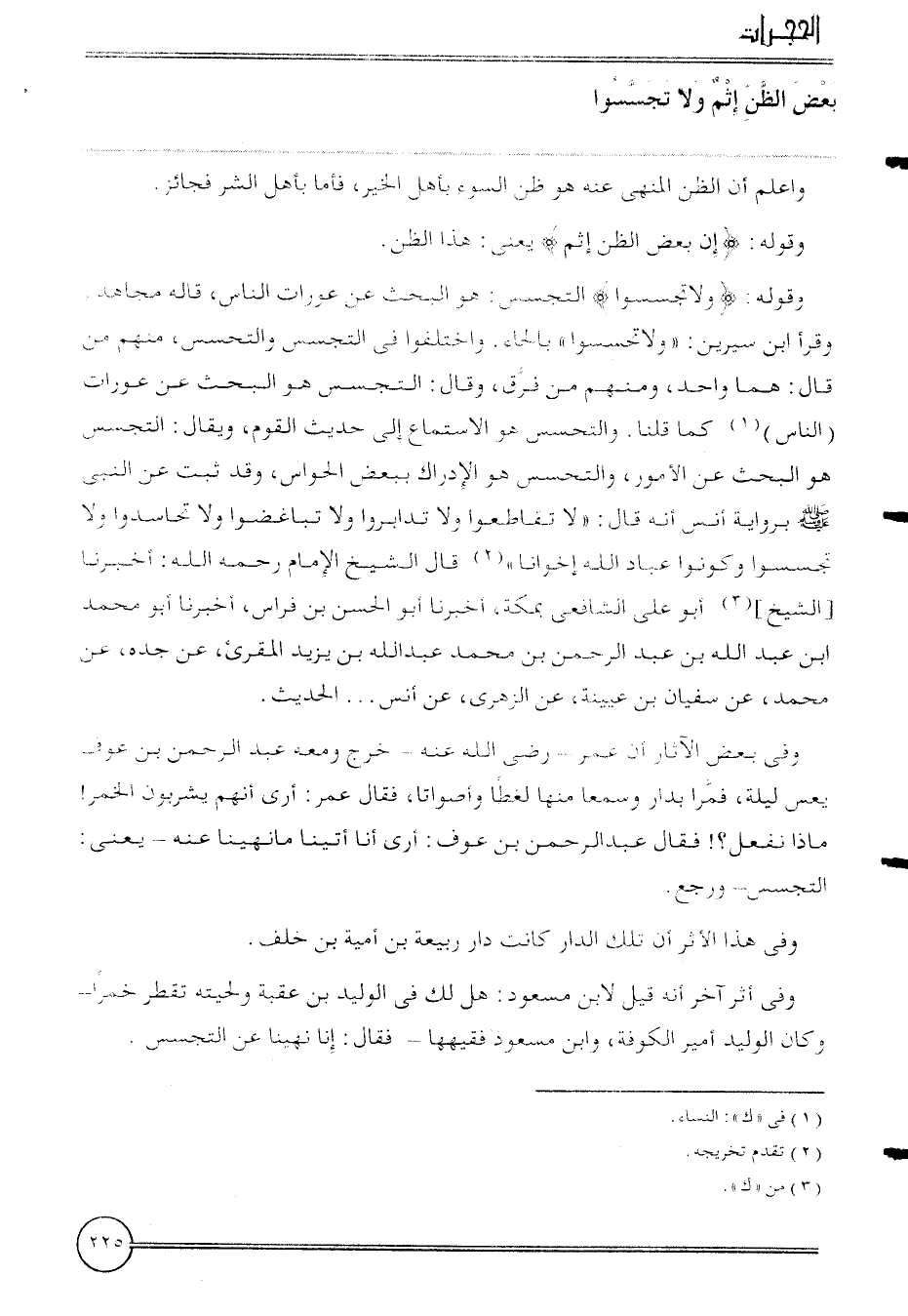 وَقَوله: {وَلَا تجسسوا} التَّجَسُّس: هُوَ الْبَحْث عَن عورات النَّاس، قَالَه مُجَاهِد وَقَرَأَ ابْن سِيرِين: " وَلَا تحسسوا " بِالْحَاء. وَاخْتلفُوا فِي التَّجَسُّس والتحسس، مِنْهُم من قَالَ: هما وَاحِد، وَمِنْهُم من فرق، وَقَالَ: التَّجَسُّس هُوَ الْبَحْث عَن عورات (النَّاس) كَمَا قُلْنَا. والتحسس هُوَ الِاسْتِمَاع إِلَى حَدِيث الْقَوْم، وَيُقَال: التَّجَسُّس هُوَ الْبَحْث عَن الْأُمُور، والتحسس هُوَ الْإِدْرَاك بِبَعْض الْحَواس، وَقد ثَبت عَن النَّبِي بِرِوَايَة أنس أَنه قَالَ: " لَا تقاطعوا وَلَا تدابروا وَلَا تباغضوا وَلَا تَحَاسَدُوا وَلَا تجسسوا وَكُونُوا عباد الله إخْوَانًا " قَالَ الشَّيْخ الإِمَام رَحمَه الله: أخبرنَا [الشَّيْخ] أَبُو عَليّ الشَّافِعِي بِمَكَّة، أخبرنَا أَبُو الْحسن بن فراس، أخبرنَا أَبُو مُحَمَّد ابْن عبد الله بن عبد الرَّحْمَن بن مُحَمَّد عبد الله بن يزِيد الْمُقْرِئ، عَن جده، عَن مُحَمَّد، عَن سُفْيَان بن عُيَيْنَة، عَن الزُّهْرِيّ، عَن أنس ... الحَدِيث.