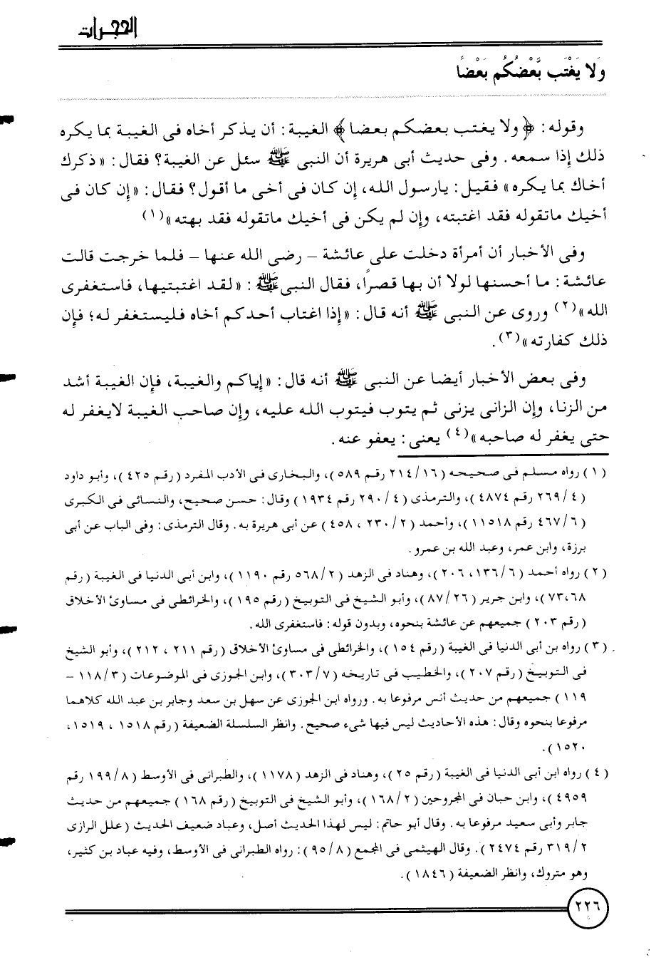 وَقَوله: {وَلَا يغتب بَعْضكُم بَعْضًا} الْغَيْبَة: أَن يذكر أَخَاهُ فِي الْغَيْبَة بِمَا يكره ذَلِك إِذا سَمعه. وَفِي حَدِيث أبي هُرَيْرَة أَن النَّبِي سُئِلَ عَن الْغَيْبَة؟ فَقَالَ: " ذكرك أَخَاك بِمَا يكره " فَقيل: يَا رَسُول الله، إِن كَانَ فِي أخي مَا أَقُول؟ فَقَالَ: " إِن كَانَ فِي أَخِيك مَا تَقوله فقد اغْتَبْته، وَإِن لم يكن فِي أَخِيك مَا تَقوله فقد بَهته "