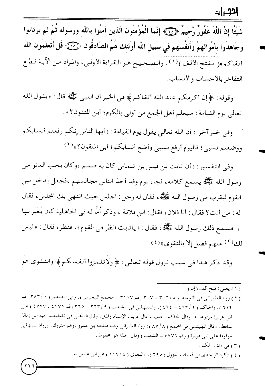 {شَيْئا إِن الله غَفُور رَحِيم (14) إِنَّمَا الْمُؤْمِنُونَ الَّذين آمنُوا بِاللَّه وَرَسُوله ثمَّ لم يرتابوا وَجَاهدُوا بِأَمْوَالِهِمْ وأنفسهم فِي سَبِيل الله أُولَئِكَ هم الصادقون (15) قل أتعلمون الله} أَتْقَاكُم " (بِفَتْح الْألف) . وَالصَّحِيح هُوَ الْقِرَاءَة الأولى، وَالْمرَاد من الْآيَة قطع التفاخر بِالْأَحْسَابِ والأنساب.