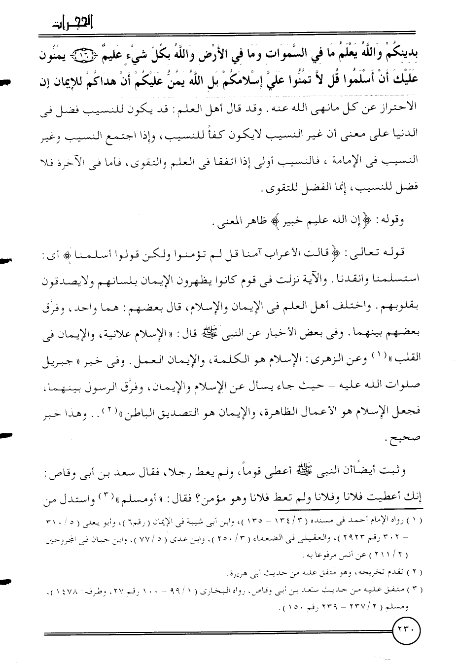 وَثَبت أَيْضا أَن النَّبِي أعْطى قوما، وَلم يُعْط رجلا، فَقَالَ سعد بن أبي وَقاص: إِنَّك أَعْطَيْت فلَانا وَفُلَانًا وَلم تعط فلَانا وَهُوَ مُؤمن؟ فَقَالَ: " أَو مُسلم " وَاسْتدلَّ من