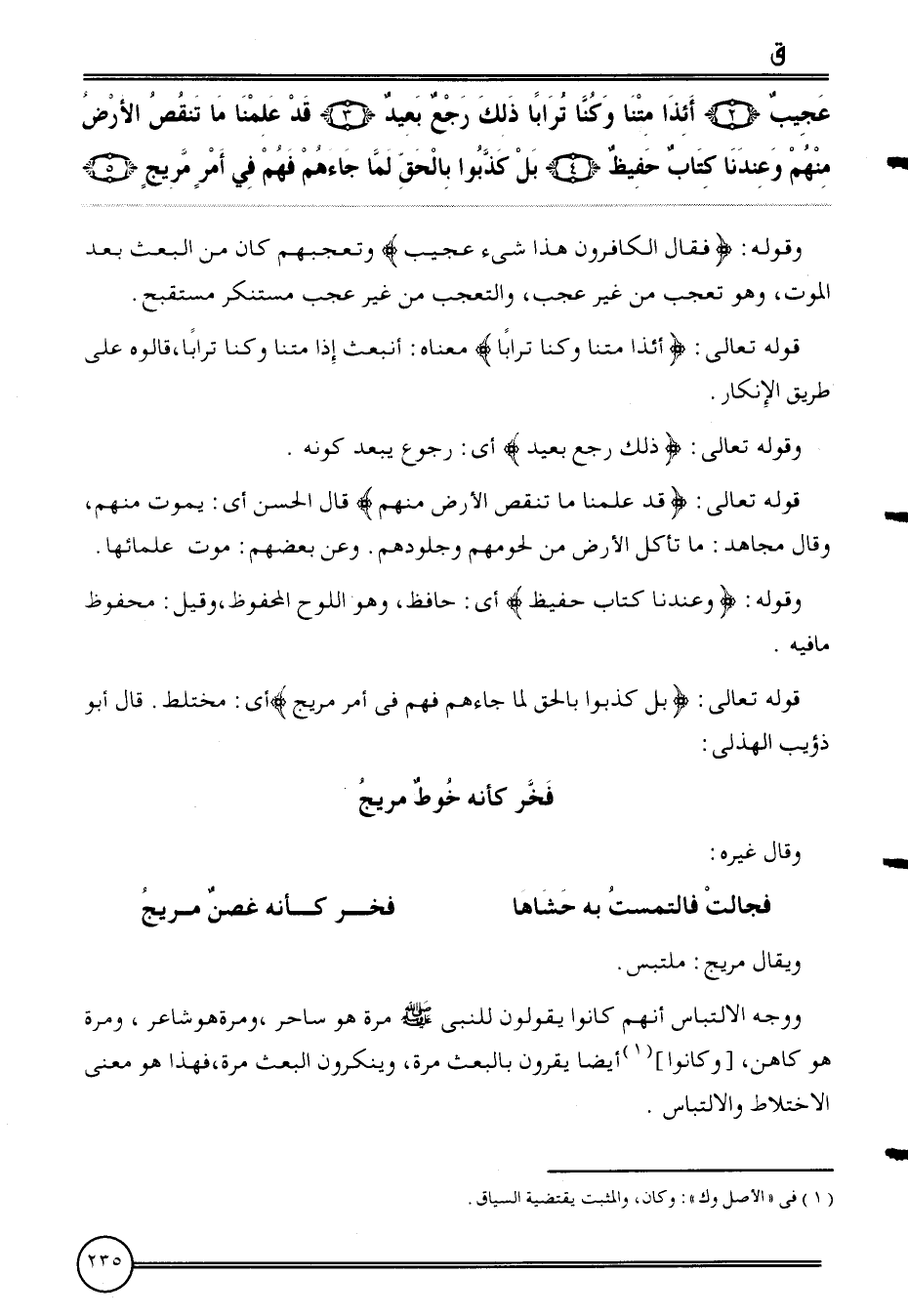 قَوْله تَعَالَى: {بل كذبُوا بِالْحَقِّ لما جَاءَهُم فهم فِي أَمر مريج} أَي: مختلط. قَالَ أَبُو ذُؤَيْب الْهُذلِيّ: