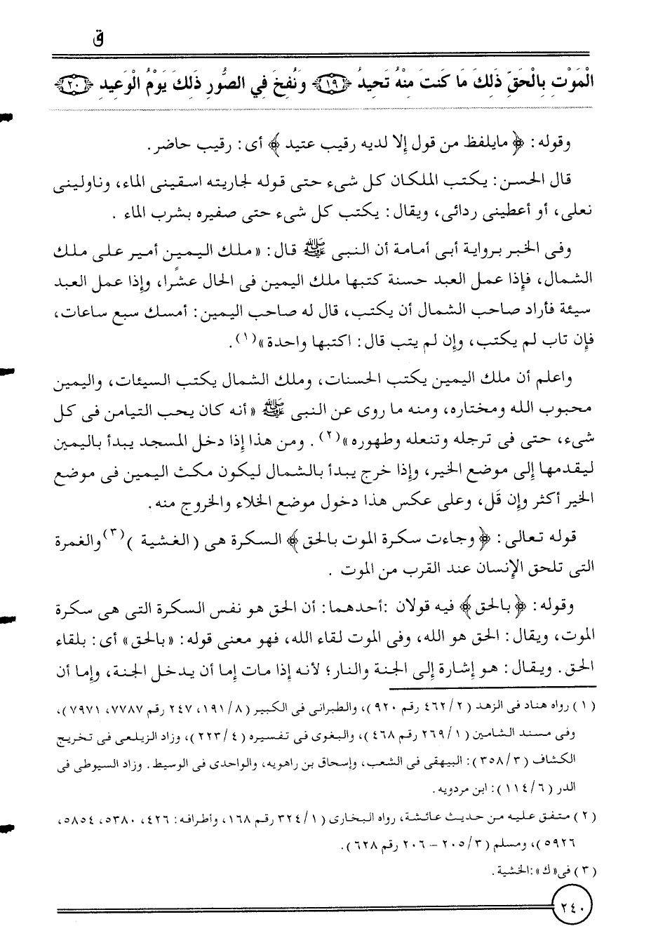 قَوْله تَعَالَى: {وَجَاءَت سكرة الْمَوْت بِالْحَقِّ} السكرة هِيَ (الغشية) والغمرة الَّتِي تلْحق الْإِنْسَان عِنْد الْقرب من الْمَوْت.