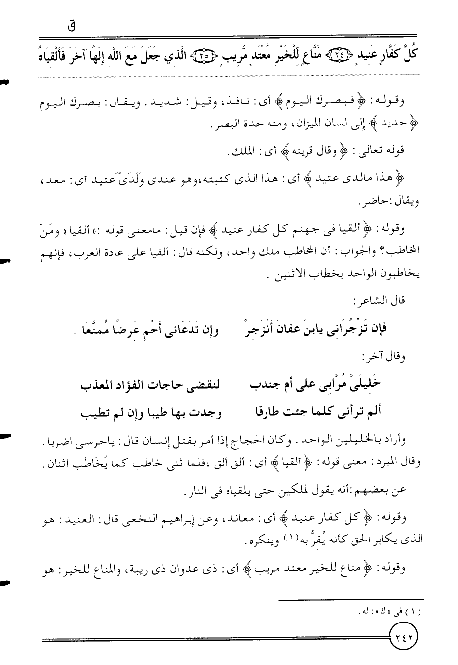 وَقَوله: {ألقيا فِي جَهَنَّم كل كفار عنيد} فَإِن قيل: مَا معنى قَوْله: " ألقيا " وَمن الْمُخَاطب؟ وَالْجَوَاب: أَن الْمُخَاطب ملك وَاحِد، وَلكنه قَالَ: ألقيا على عَادَة الْعَرَب، فَإِنَّهُم يخاطبون الْوَاحِد بخطاب الِاثْنَيْنِ.