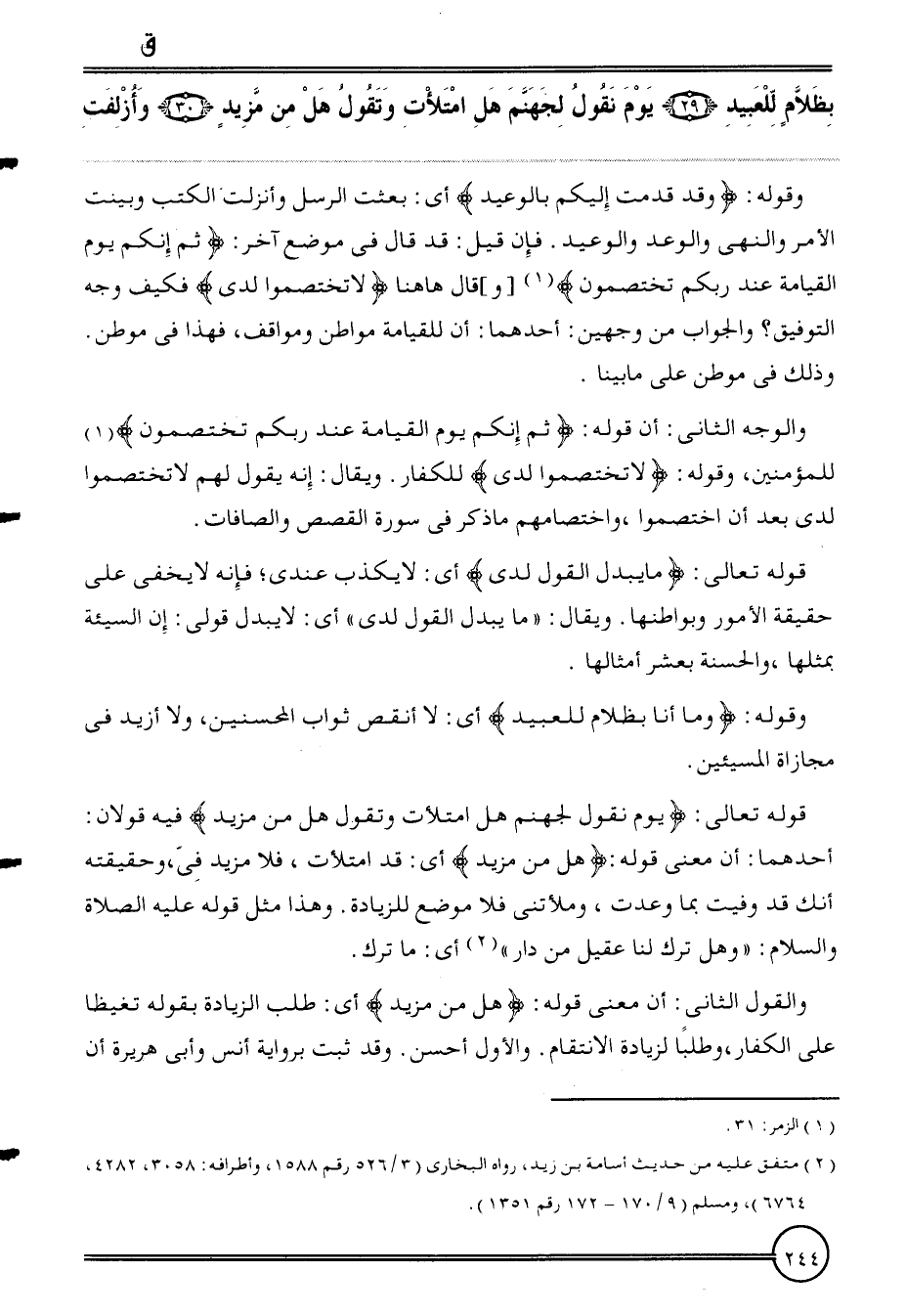 قَوْله تَعَالَى: {يَوْم نقُول لِجَهَنَّم هَل امْتَلَأت وَتقول هَل من مزِيد} فِيهِ قَولَانِ: أَحدهمَا: أَن معنى قَوْله: {هَل من مزِيد} أَي: قد امْتَلَأت، فَلَا مزِيد فِي، وَحَقِيقَته أَنَّك قد وفيت بِمَا وعدت، وملأتني فَلَا مَوضِع للزِّيَادَة. وَهَذَا مثل قَوْله عَلَيْهِ الصَّلَاة وَالسَّلَام: " وَهل ترك لنا عقيل من دَار " أَي: مَا ترك.