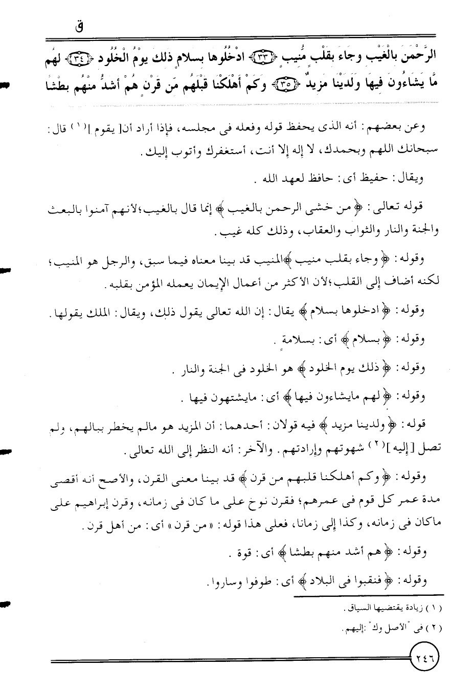 {الرَّحْمَن بِالْغَيْبِ وَجَاء بقلب منيب (33) ادخلوها بِسَلام ذَلِك يَوْم الخلود (34) لَهُم مَا يشاءون فِيهَا ولدينا مزِيد (34) وَكم أهلكنا قبلهم من قرن هم أَشد مِنْهُم بطشا}