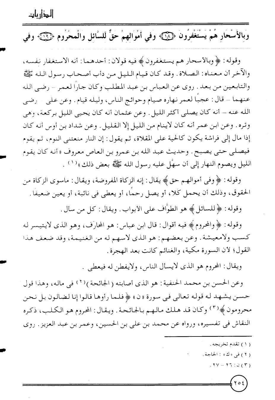 وَقَوله: {وبالأسحار هم يَسْتَغْفِرُونَ} فِيهِ قَولَانِ: أَحدهمَا: أَنه الاسْتِغْفَار نَفسه، وَالْآخر أَن مَعْنَاهُ: الصَّلَاة. وَقد كَانَ فِي قيام اللَّيْل من دأب أَصْحَاب رَسُول الله وَالتَّابِعِينَ من بعد. رُوِيَ عَن الْعَبَّاس بن عبد الْمطلب وَكَانَ جارا لعمر رَضِي الله عَنْهُمَا قَالَ: عجبا لعمر نَهَاره صِيَام وحوائج النَّاس، وَلَيْلَة قيام. وَعَن عَليّ رَضِي الله عَنهُ أَنه كَانَ يُصَلِّي أَكثر اللَّيْل. وَعَن عُثْمَان أَنه كَانَ يحيي اللَّيْل بِرَكْعَة، وَهِي وتره. وَعَن ابْن عمر أَنه كَانَ لَا ينَام من اللَّيْل إِلَّا الْقَلِيل. وَعَن شَدَّاد بن أَوْس أَنه كَانَ إِذا مَال إِلَى فرَاشه يكون كالحية على المقلاة، ثمَّ يَقُول: إِن النَّار منعتني النّوم، ثمَّ يقوم فَيصَلي حَتَّى يصبح. وَحَدِيث عبد الله بن عَمْرو بن الْعَاصِ مَعْرُوف " أَنه كَانَ يقوم اللَّيْل ويصوم النَّهَار إِلَى أَن سهل عَلَيْهِ رَسُول الله بعض ذَلِك ".