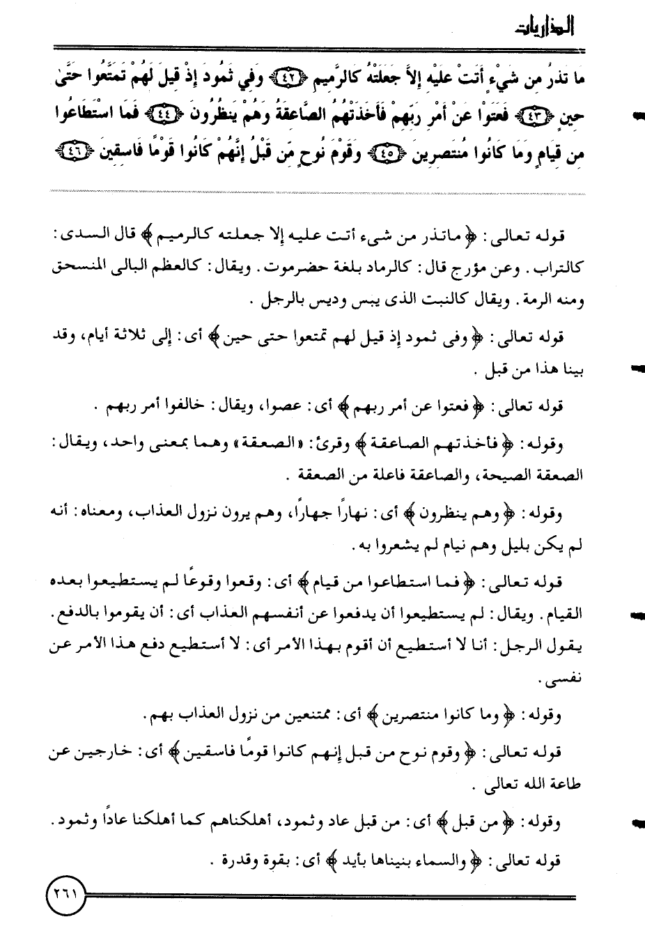 {مَا تذر من شَيْء أَنْت عَلَيْهِ إِلَّا جعلته كالرميم (42) وَفِي ثَمُود إِذْ قيل لَهُم تمَتَّعُوا حَتَّى حِين (43) فَعَتَوْا عَن أَمر رَبهم فَأَخَذتهم الصاعقة وهم ينظرُونَ (4) فَمَا اسْتَطَاعُوا من قيام وَمَا كَانُوا منتصرين (45) وَقوم نوح من قبل إِنَّهُم كَانُوا قوما فاسقين (46) }