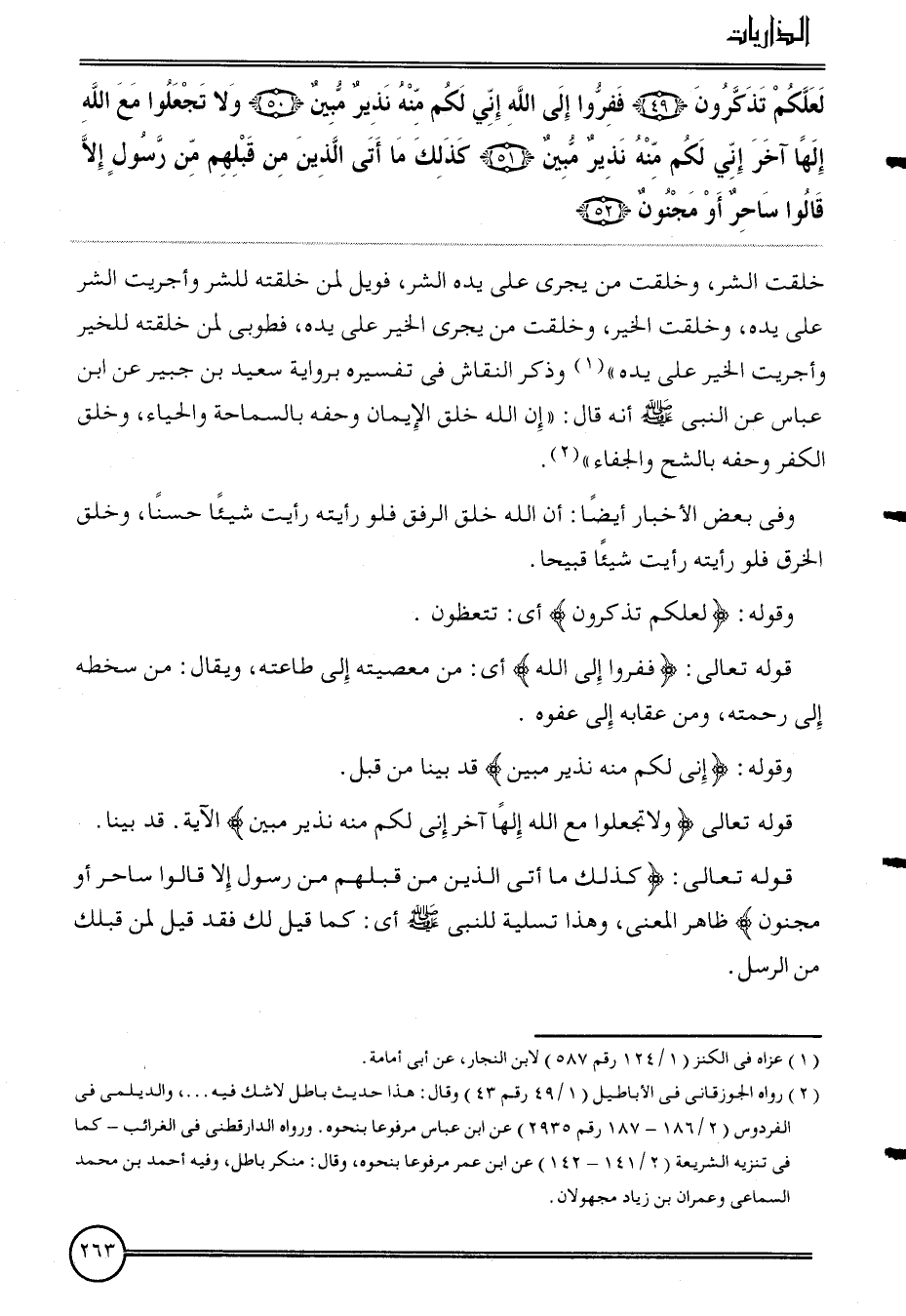{لَعَلَّكُمْ تذكرُونَ (49) فَفرُّوا إِلَى الله إِنِّي لكم مِنْهُ نَذِير مُبين (50) وَلَا تجْعَلُوا مَعَ الله إِلَهًا آخر إِنِّي لكم مِنْهُ نَذِير مُبين (51) كَذَلِك مَا أَتَى الَّذين من قبلهم من رَسُول إِلَّا قَالُوا سَاحر أَو مَجْنُون (52) } خلقت الشَّرّ، وخلقت من يجْرِي على يَده الشَّرّ، فويل لمن خلقته للشر وأجريت الشَّرّ على يَده، وخلقت الْخَيْر، وخلقت من يجْرِي الْخَيْر على يَده، فطوبى لمن خلقته للخير وأجريت الْخَيْر على يَده " وَذكر النقاش فِي تَفْسِيره بِرِوَايَة سعيد بن جُبَير عَن ابْن عَبَّاس عَن النَّبِي أَنه قَالَ: " إِن الله خلق الْإِيمَان وحفه بالسماحة وَالْحيَاء، وَخلق الْكفْر وحفه بالشح والجفاء ".