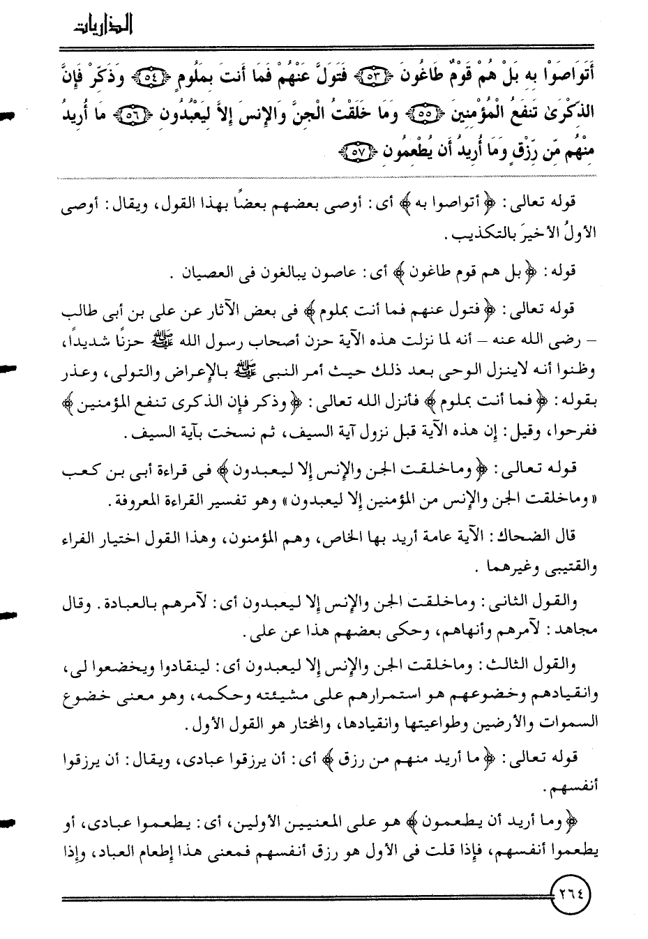 {أتواصوا بِهِ بل هم قوم طاغون (53) فتول عَنْهُم فَمَا أَنْت بملوم (54) وَذكر فَإِن الذكرى تَنْفَع الْمُؤمنِينَ (55) وَمَا خلقت الْجِنّ وَالْإِنْس إِلَّا ليعبدون (56) مَا أُرِيد مِنْهُم من رزق وَمَا أُرِيد أَن يطْعمُون (57) }