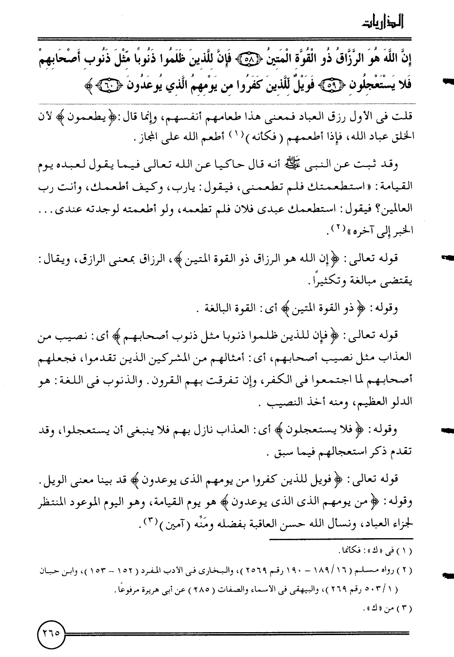 {إِن الله هُوَ الرَّزَّاق ذُو الْقُوَّة المتين (58) فَإِن للَّذين ظلمُوا ذنوبا مثل ذنُوب أَصْحَابهم فَلَا يستعجلون (59) فويل للَّذين كفرُوا من يومهم الَّذِي يوعدون (60) } قلت فِي الأول رزق الْعباد فَمَعْنَى هَذَا إطعامهم أنفسهم، وَإِنَّمَا قَالَ: {يطْعمُون} لِأَن الْخلق عباد الله، فَإِذا أطْعمهُم (فَكَأَنَّهُ) أطْعم الله على الْمجَاز.